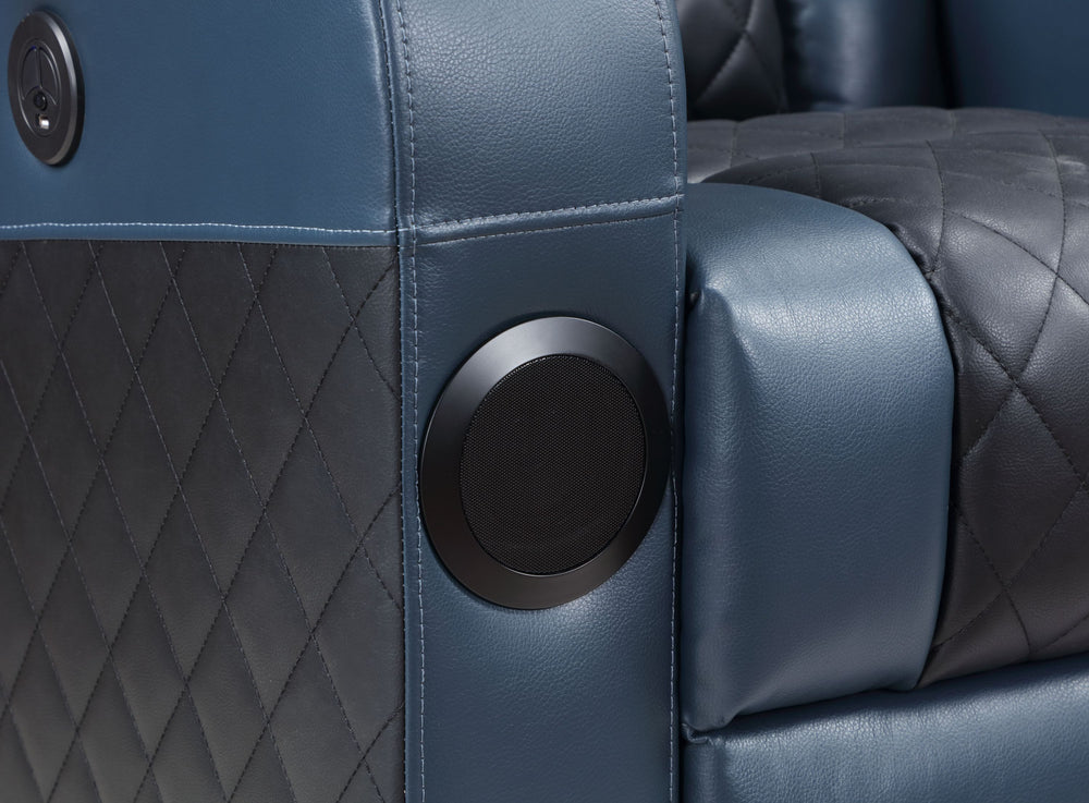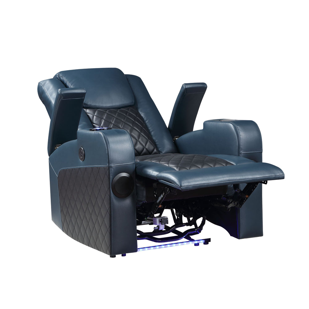 Unwind in style and comfort with this high-performance power motion recliner, crafted with sleek black and blue faux leather upholstery and durable synthetic wood accents. Designed to elevate your living space, it features advanced pocket coil seating and multi-density foam cushions that contour to your body for all-day support. Enjoy immersive sound through built-in Bluetooth speakers while charging your devices wirelessly. The cooling cup holder keeps your beverages chilled, making it perfect for movie nights or relaxation sessions. With a smooth reclining angle up to 140 degrees and smart storage armrests, this recliner blends modern convenience with ergonomic design. Elevate your relaxation today and transform your home comfort.