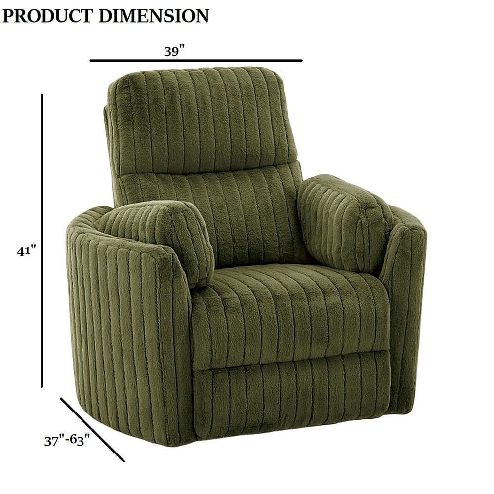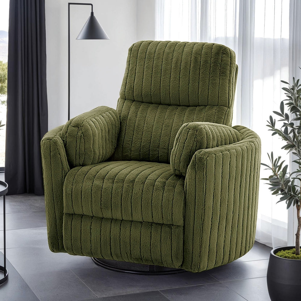 Contemporary olive green power recliner with fabric and foam upholstery offers adjustable reclining, gliding motion, and 360° swivel for versatile seating comfort. Features curved arms, pillow fill, and seat pocket coil, ideal for primary living spaces.