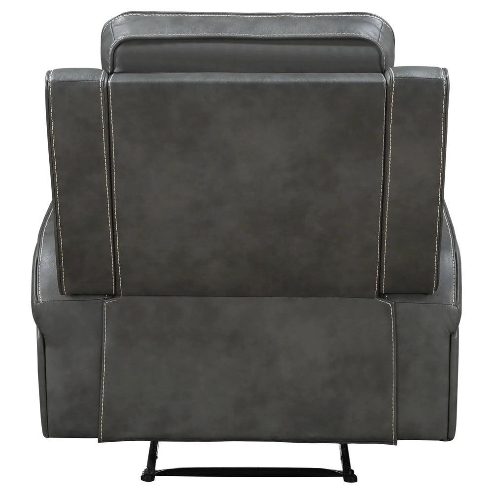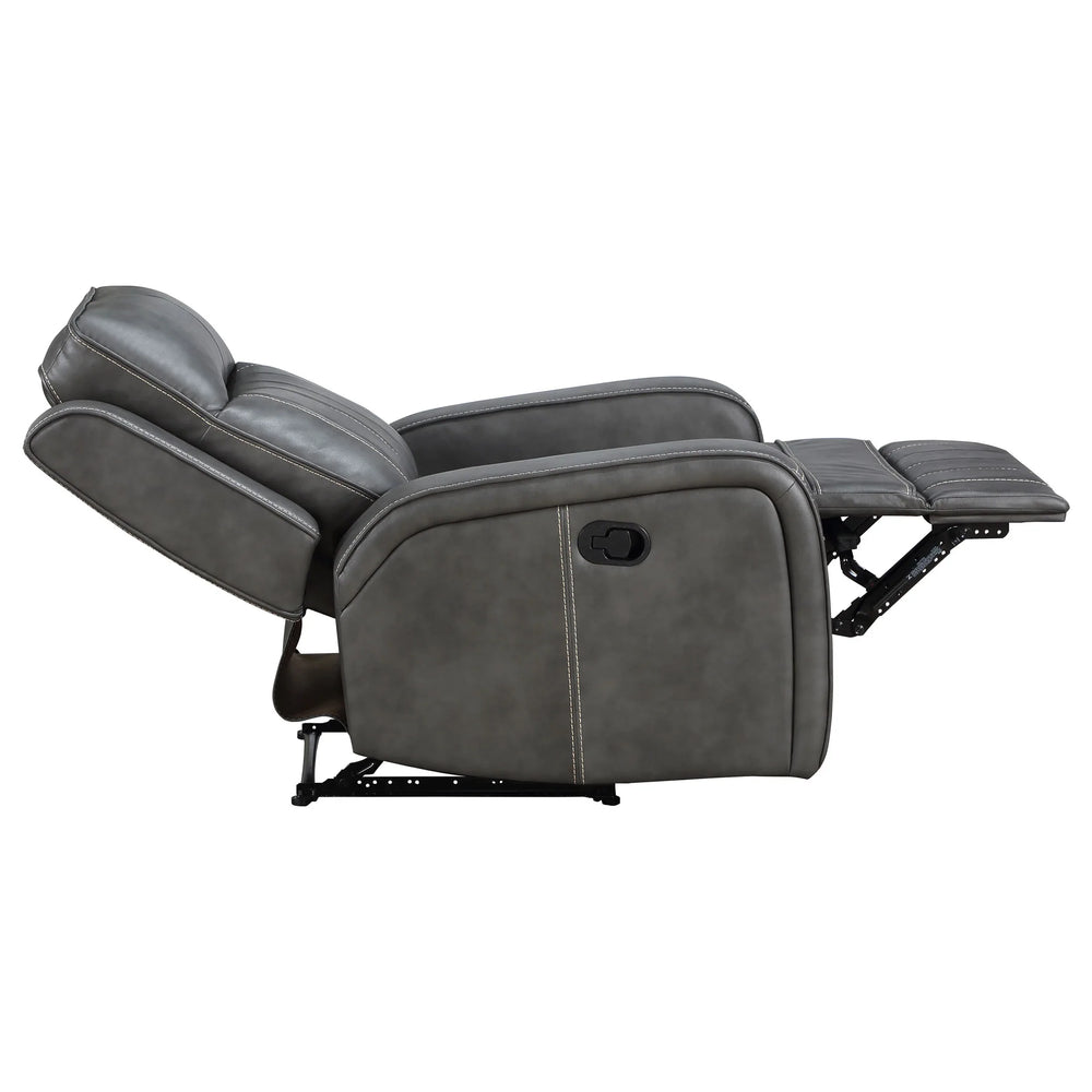 This grey upholstered recliner features plush foam cushioning and a manual reclining mechanism for customizable comfort. Its durable leatherette upholstery with decorative stitching offers easy maintenance, making it ideal for primary living spaces seeking versatile relaxation seating.