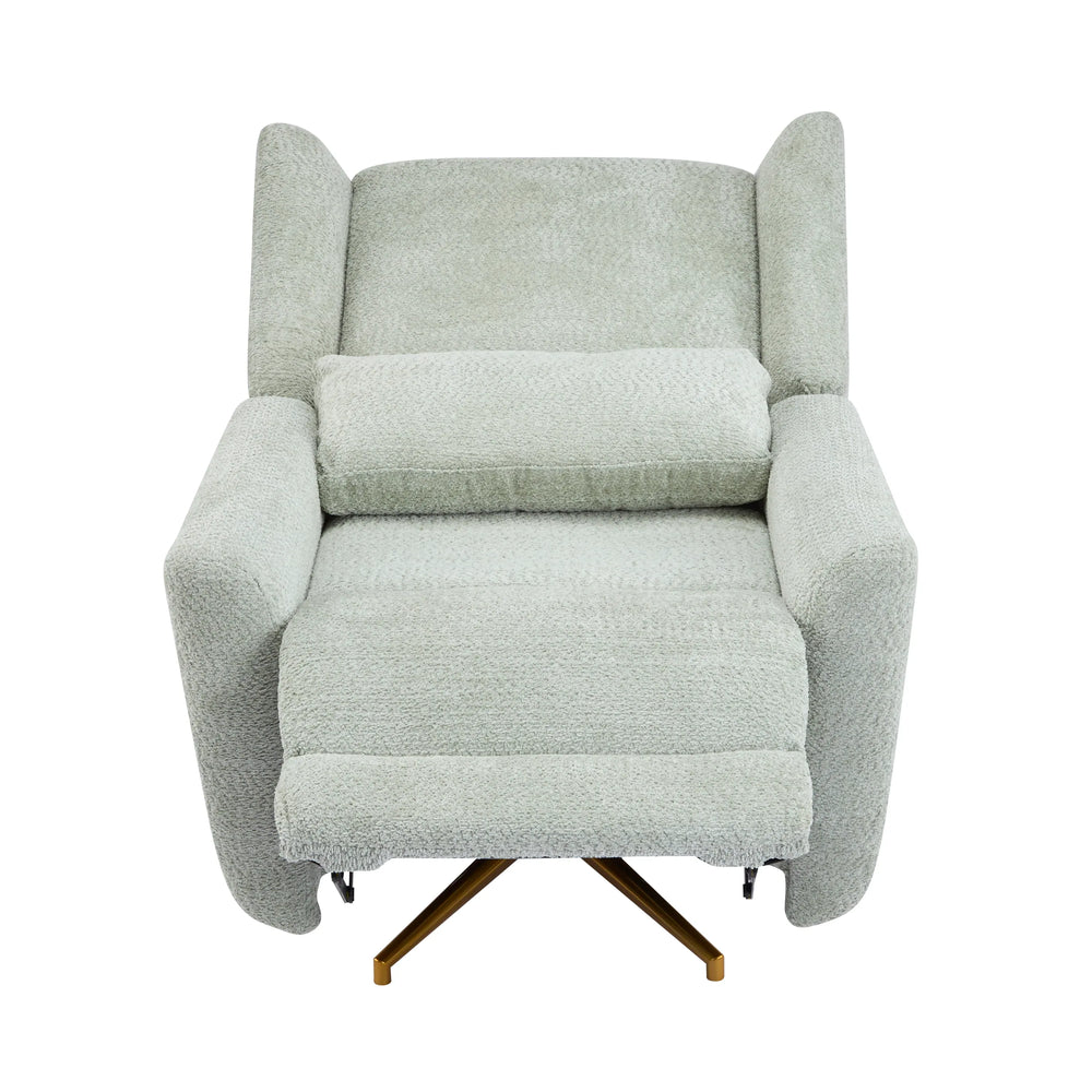 Upgrade your relaxation space with this stylish boucle upholstered power recliner, featuring a luxurious light green fabric and a sturdy gold 5-star iron base. Designed for comfort and versatility, it swivels smoothly a full 360 degrees, providing flexible positioning without the hassle of wire entanglement. The easy-to-use two-button power recline allows you to adjust the backrest from 90° to 165°, while the extendable footrest enhances your lounging experience. Its fully padded ergonomic backrest with double winged design supports your posture perfectly during reading, gaming, or napping. Compact yet durable, this recliner measures 32.75 inches long, 35 inches wide, and 41 inches high, supporting up to 250 pounds. Whether you’re a busy parent, a gamer, or simply craving a cozy spot to unwind, this chair blends style and function effortlessly. Elevate your relaxation today.