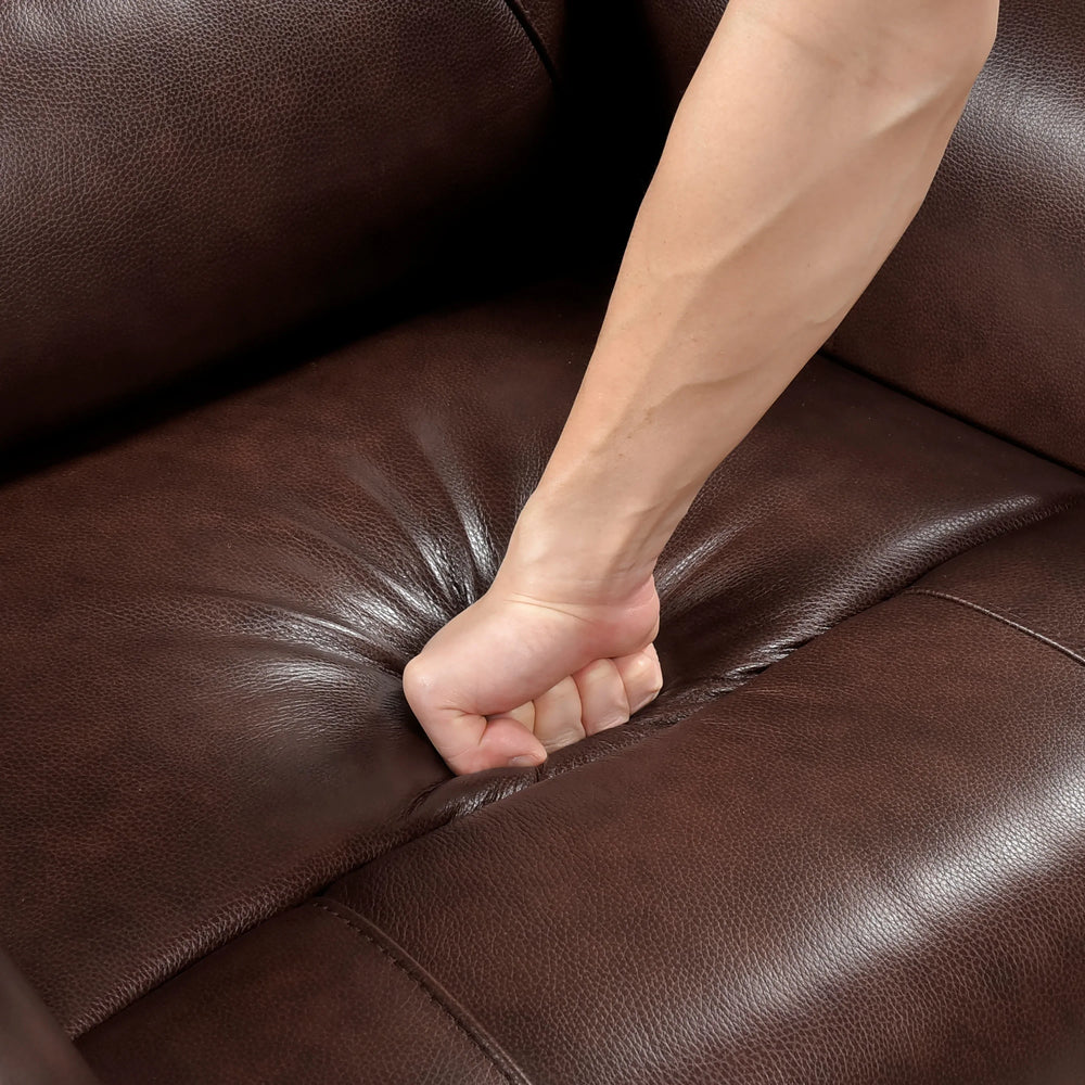 Relax in style and exceptional comfort with this brown leather recliner chair, crafted to enhance your living room. Featuring a solid wood and plywood frame reinforced with metal for lasting durability, it supports up to 300 lbs with ease. The high-density foam padding over pocket coils cushions your body while the top grain leather upholstery where you sit adds a premium touch that feels soft yet durable. Effortlessly recline using the pull-handle mechanism, then enjoy a smooth 360-degree swivel and gentle gliding motion that adapt perfectly to your relaxation needs. The attached cushions provide a sleek, modern look without compromising comfort. With its combination of luxury materials and versatile motion, this recliner brings timeless elegance and practical comfort to your primary living space. Elevate your relaxation today.