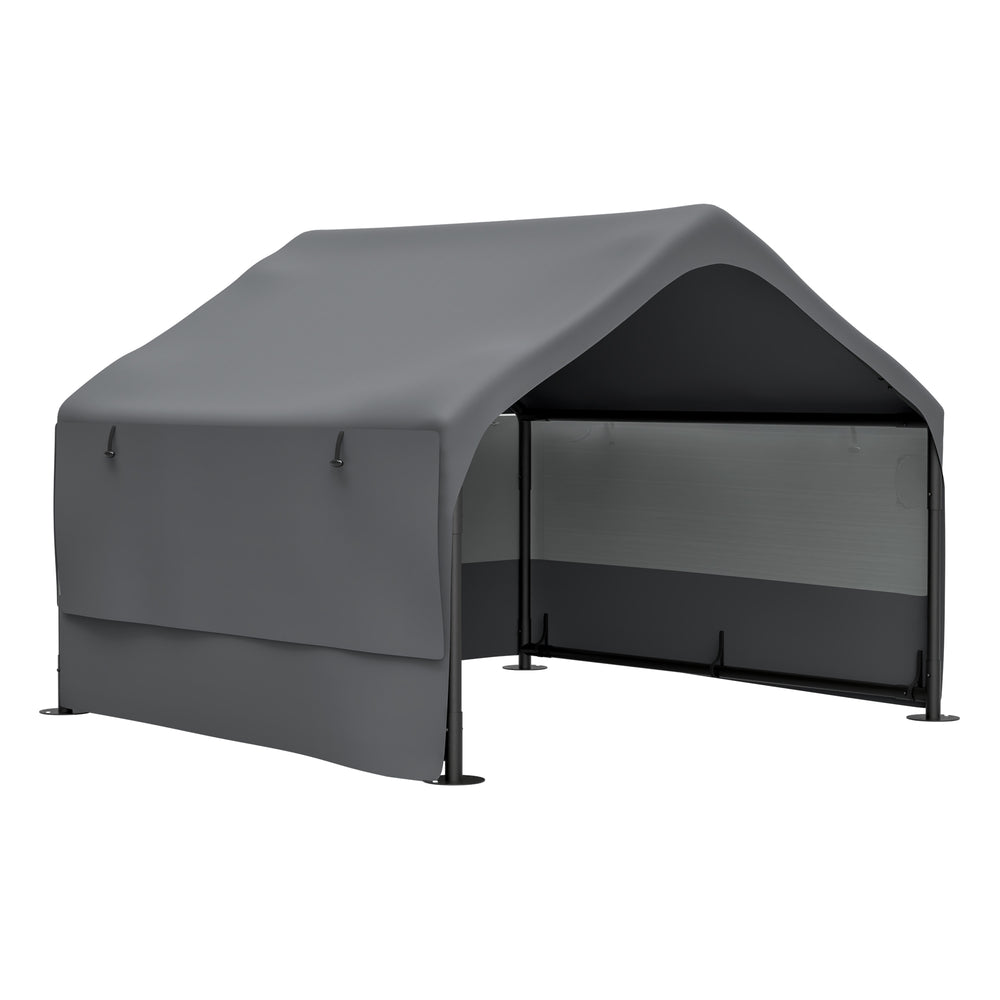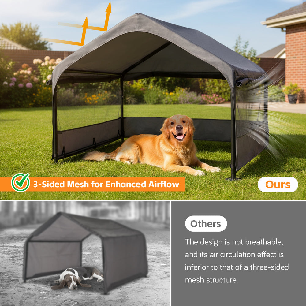 Extra large outdoor pet shelter features a durable galvanized steel frame and breathable three-sided mesh for ventilation while protecting pets from insects. Waterproof, UV-resistant Oxford fabric and foldable design offer all-weather comfort and portability for dogs, cats, and livestock.