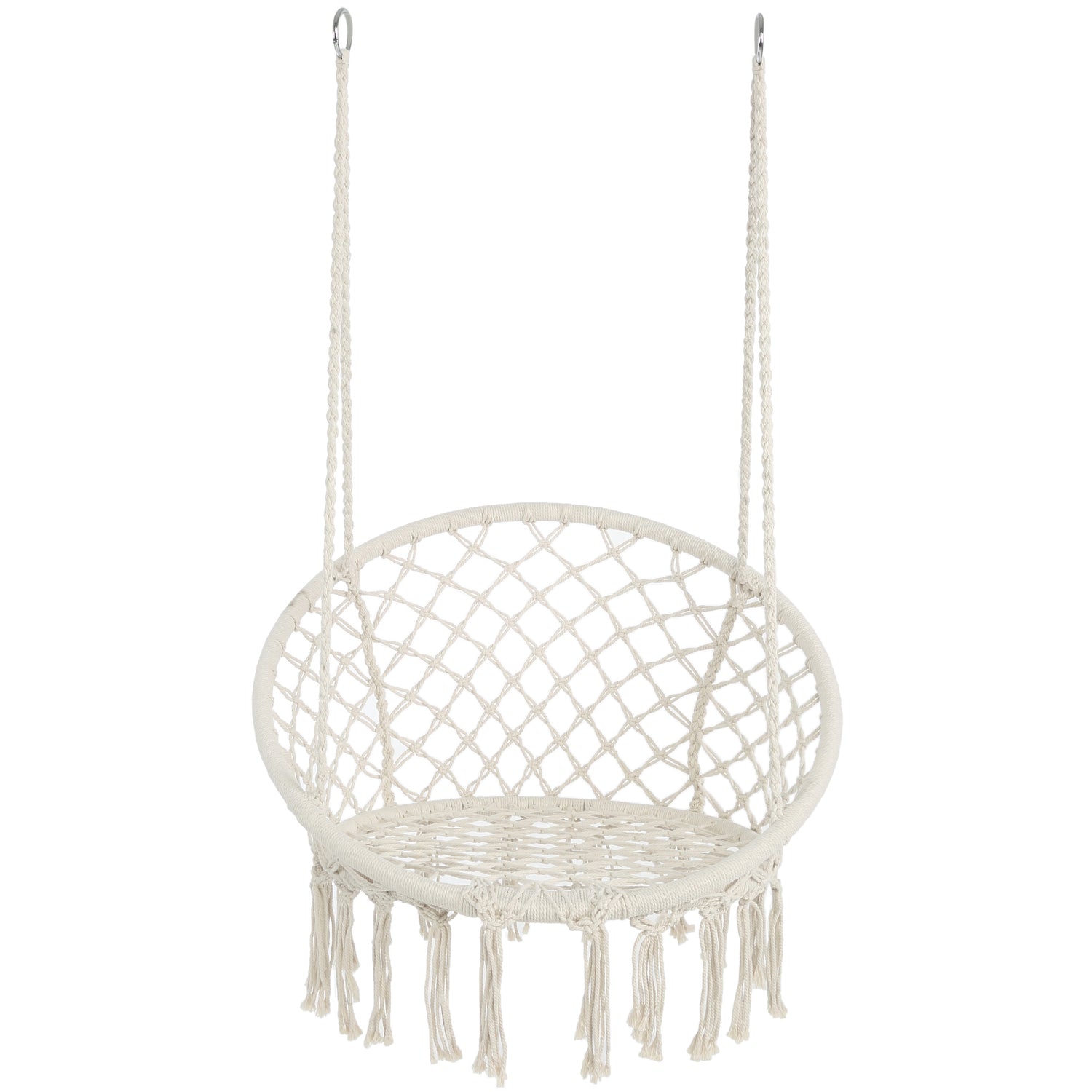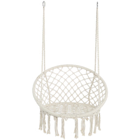 Unwind in style with this handcrafted macrame hanging hammock chair, perfect for both indoor and outdoor relaxation. Made from soft, durable cotton rope, it features a spacious design measuring 31.5 inches long, 23.6 inches wide, and 47.2 inches high, providing ample room to stretch out and relax. The sturdy frame supports up to 330 pounds, ensuring safe and reliable comfort. Its lightweight 7-pound build makes it easy to carry and hang from a ceiling, tree, or sturdy overhang. With its flowing fringe and bohemian beige tone, this swing chair adds charm to any patio, garden, bedroom, or living space. Whether you want to read, meditate, or simply enjoy nature, this macrame rope hammock chair creates a cozy escape for your downtime. Elevate your relaxation today.