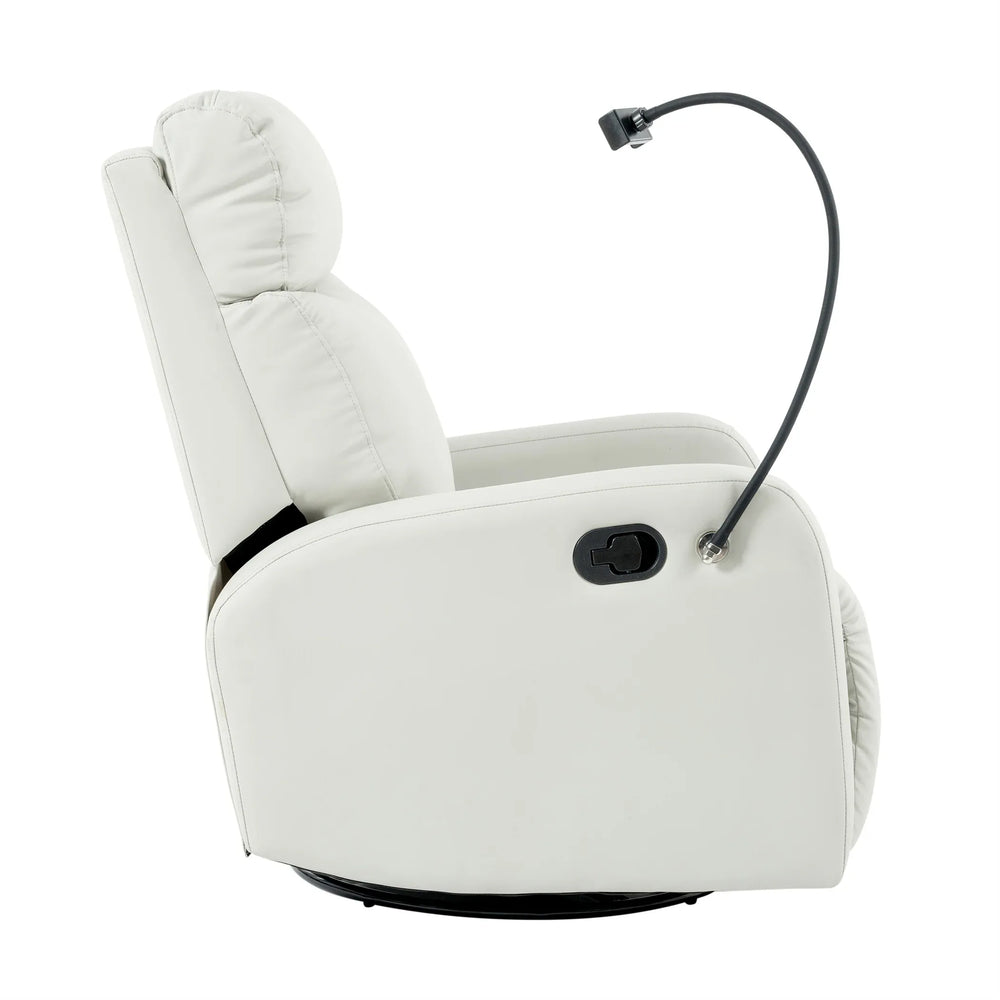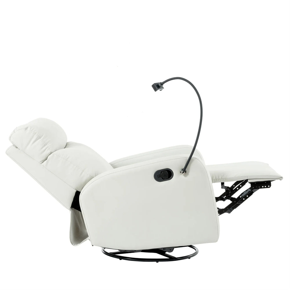 Omega Lifestyles rocking recliner chair features 360° swivel, 30° rocking, and adjustable 95-160° reclining for versatile comfort. Padded with high-density foam and a soft PU surface, it suits primary living spaces and nursery use, supporting up to 330 lbs.