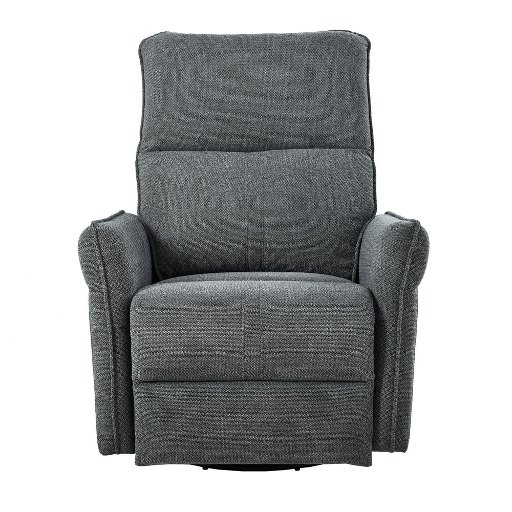 Omega Lifestyles power swivel rocker recliner chair offers 270° swiveling, 30° rocking, and 95°-150° reclining with push-button control. Upholstered in breathable snowflake velvet fabric with foam padding, it suits living rooms, nurseries, and small spaces for versatile comfort.