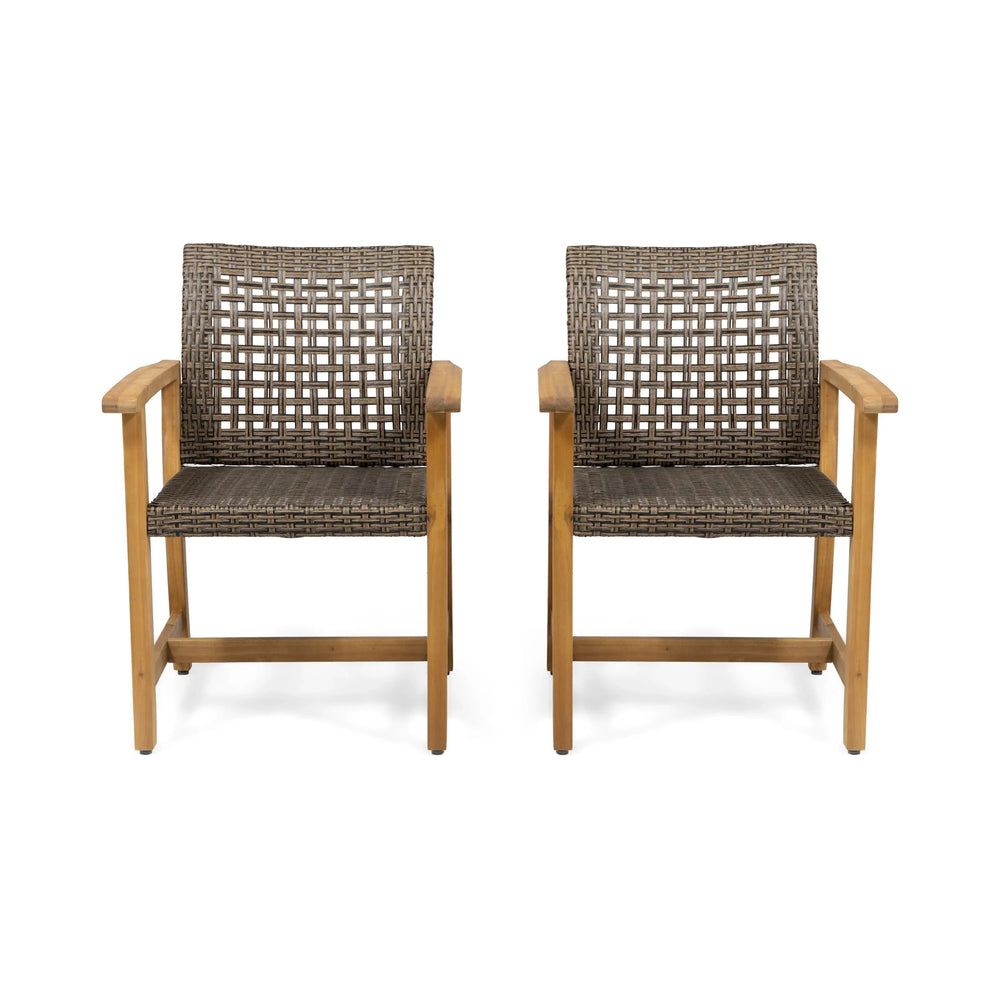 Bring timeless style and lasting comfort to your dining area with this elegant set of two Hampton Wood and Wicker Dining Chairs. Crafted from durable acacia wood with a complementing finish, each chair offers natural resistance to outdoor and indoor wear, making them perfect for long-term use. The woven polyethylene rattan adds texture and a versatile look that blends seamlessly with various décor styles. Designed to support up to 400 pounds, these chairs provide both strength and stability. Their compact size, measuring 26.25 inches wide, 23.75 inches deep, and 33.75 inches high, fits effortlessly around any dining table without sacrificing comfort. Whether used indoors or on the patio, this set is ideal for enhancing casual meals or elegant gatherings. Upgrade your space with the perfect blend of function and style—elevate your relaxation and dining ambiance today.