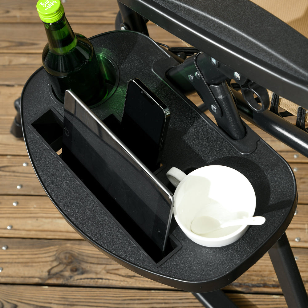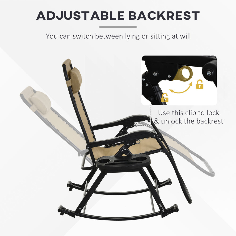 Unwind in style and comfort with this set of two foldable outdoor rocking chairs featuring zero-gravity reclining design. Crafted with a durable steel frame and breathable fabric, these loungers offer soothing bungee suspension that cushions every movement. Whether you want to rock gently, recline fully with the adjustable footrest, or sit upright, the plush pillows provide added neck support for extended outdoor relaxation. Each chair includes convenient cup and phone holders, ensuring your essentials are always within reach. Lightweight and foldable, these chairs easily fit in your car for beach days, camping, or backyard lounging. With a powder-coated finish that resists water and a strong frame supporting up to 265 lbs, these rocking loungers are perfect for year-round outdoor use. Elevate your relaxation today and transform any outdoor space into your personal retreat.