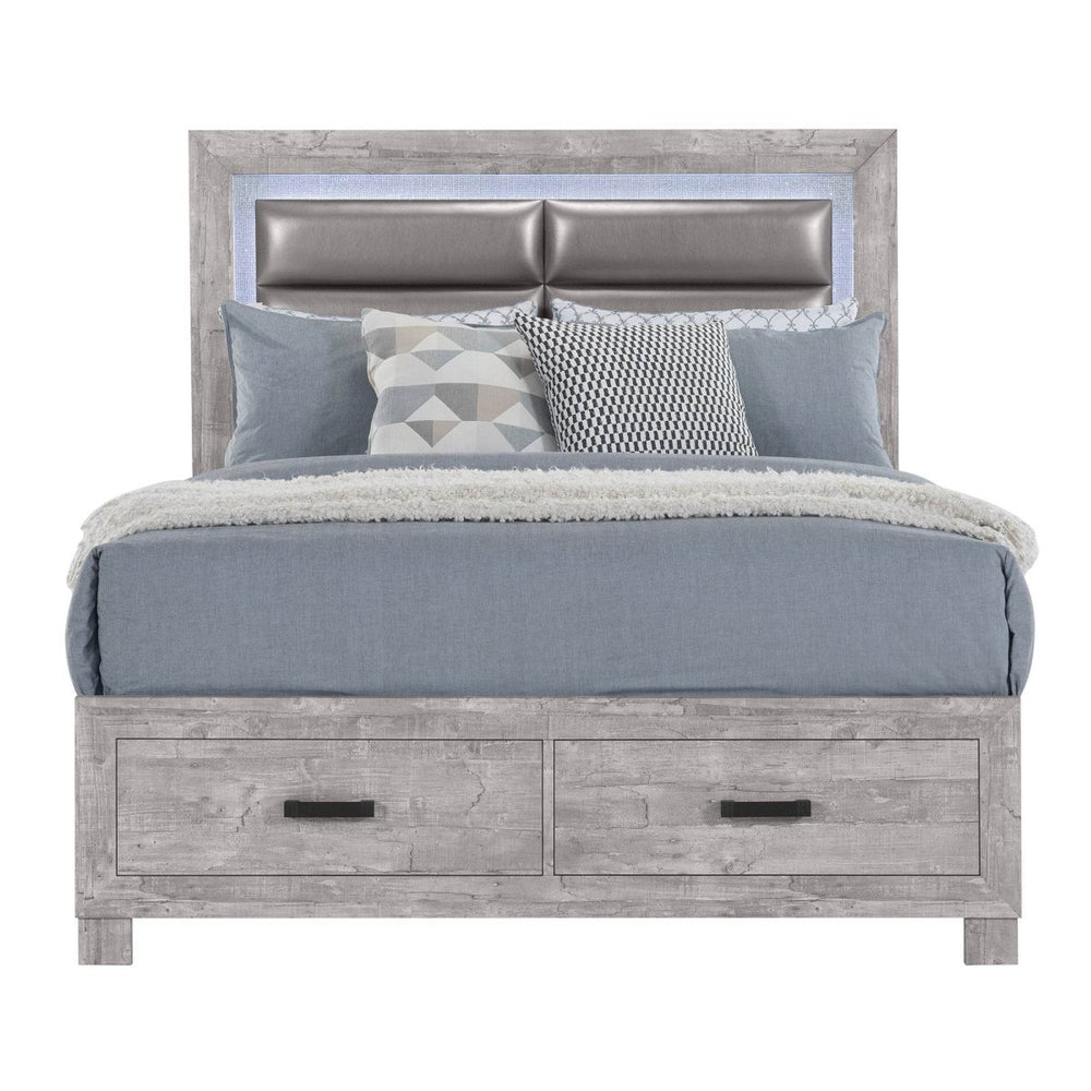 Farmhouse style bed frame features solid wood and MDF construction with a light grey paper finish and sleek grey tones. Includes footboard storage for added convenience, offering sturdy comfort and versatile design for bedroom organization and relaxation.