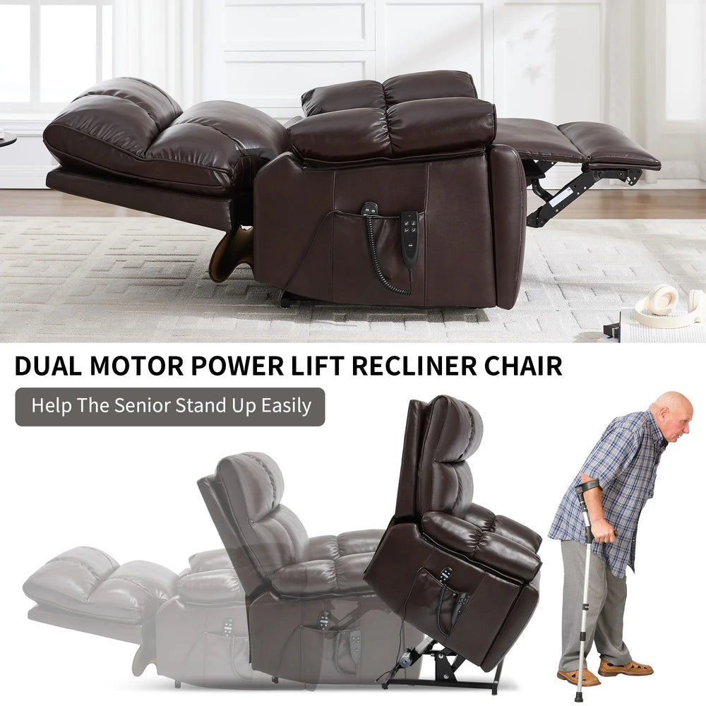 This oversized electric power lift recliner delivers comfortable, medium-firm seating combined with advanced massage and heat therapy, making it an ideal choice for primary living spaces. Upholstered in rich brown faux leather, it offers a durable and easy-to-clean surface with plush fiber foam and polyester padding for lasting comfort. The dual motor system allows smooth, silent adjustments to infinite positions, including nearly 180-degree recline and power lift assistance to help you stand with ease. Featuring 8 vibrating massage nodes and a lumbar heat function, this chair promotes blood circulation and relieves muscle tension. Its generous dimensions support up to 350 pounds, accommodating larger users. Convenient dual side pockets provide handy storage for essentials, while white pine wood accents add classic American style. Elevate your living room comfort and enjoy restorative relaxation today.