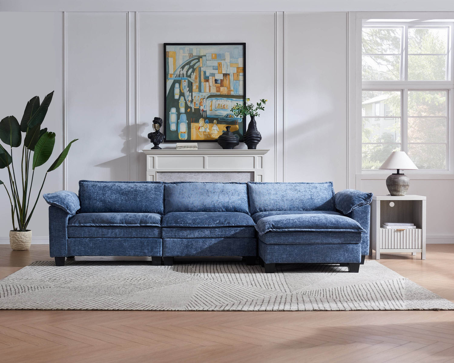 Relax and unwind on this modern sectional couch, designed to bring both style and comfort to your living space. The 120-inch L-shaped sofa features deep 22.4-inch seats filled with high-resilience foam cushions that cradle your body for lasting relaxation. Upholstered in soft, skin-friendly blue chenille fabric, this versatile sectional includes a movable ottoman, allowing you to customize your seating arrangement to fit your living room, apartment, office, or studio. Built on a sturdy wood frame with reinforced metal support, it promises durability while maintaining lightweight elegance. Easy to assemble without tools, this fluffy cloud sofa makes upgrading your space effortless and inviting. Elevate your relaxation today with a sectional that adapts to your lifestyle.