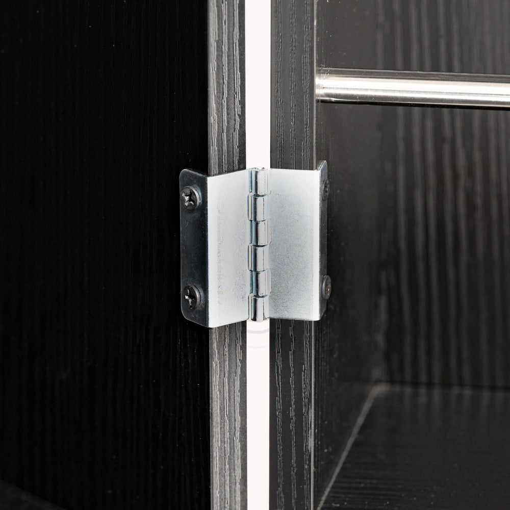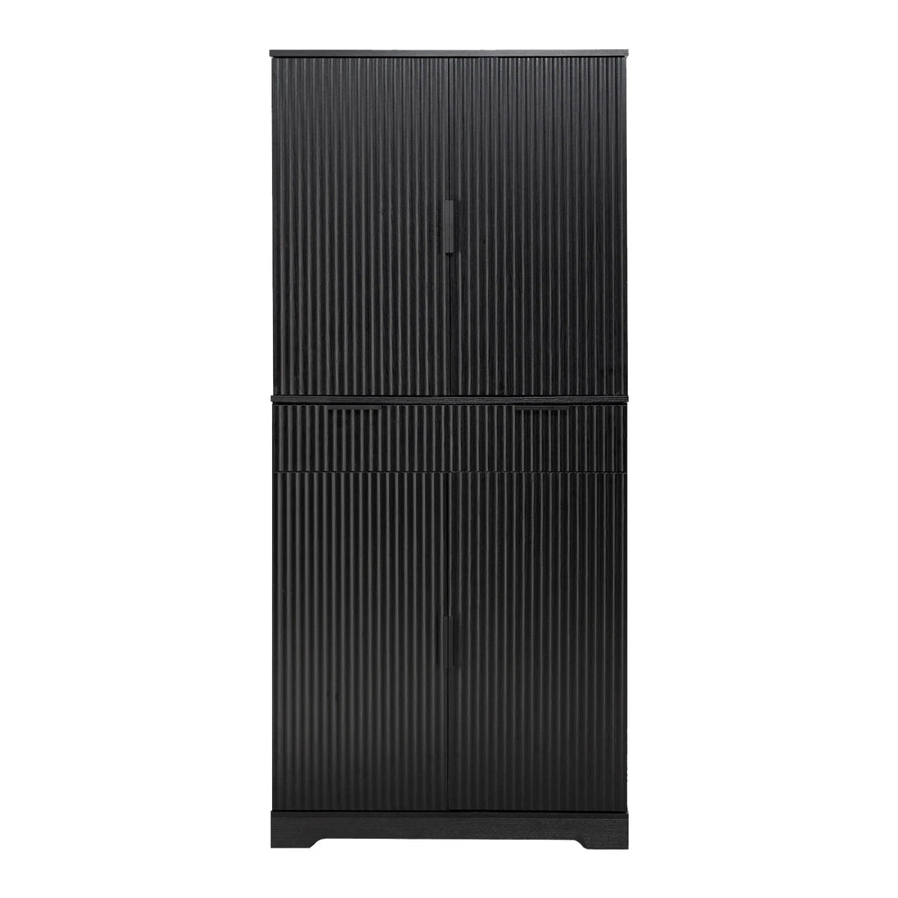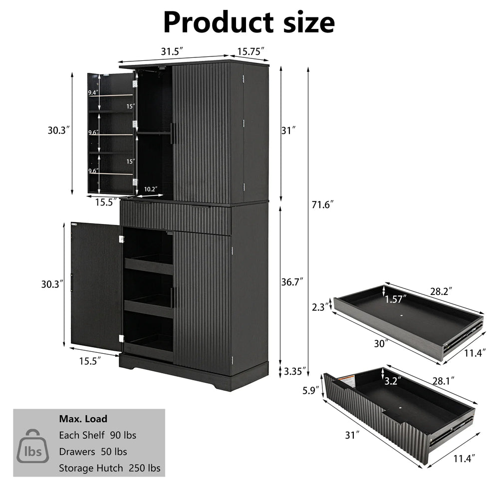 Upgrade your kitchen or any living space with this tall, freestanding pantry cabinet that blends classic Parisian-inspired fluted design with practical organization. Crafted from durable MDF with a sleek black finish, it offers fridge-style storage with multiple shelves and compartments that neatly house dry goods, snacks, dinnerware, and more. The three unique keyboard drawers provide orderly storage for smaller essentials like napkins and cutlery, making everyday access effortless. Integrated spice racks on both doors keep your spices visible and secure, while the triple-fold hinges allow wide door opening for easy loading and unloading. Thoughtfully engineered with triangular stabilizing and anti-tilt devices, this cabinet ensures lasting stability and safety in busy areas like kitchens, bathrooms, offices, or entryways. Its moisture-resistant surface and robust construction make it a reliable, stylish storage solution. Elevate your home’s organization and sophistication today.