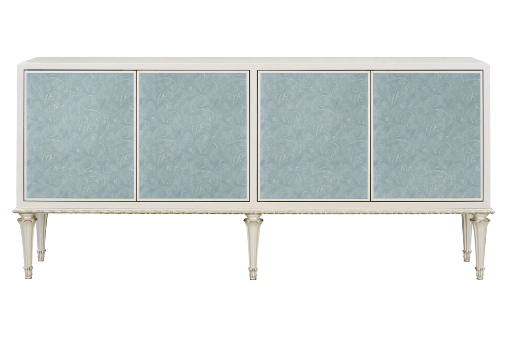 Omega Lifestyles console cabinet features a pearl white and silver finish with patterned glass doors, ornate wooden legs, and touch-open magnetic catch doors. Its French Provincial design offers elegant storage with multiple shelves, ideal for stylish living room organization.