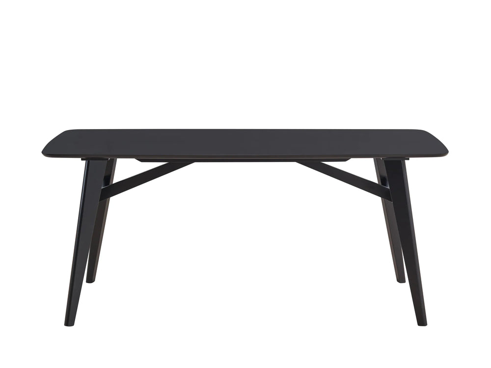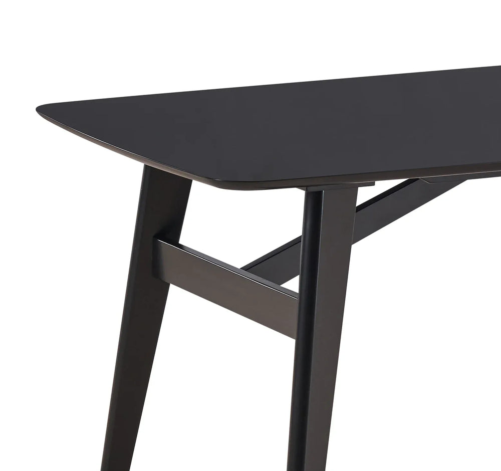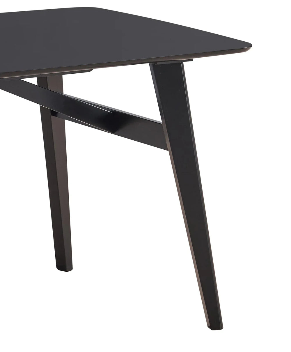 Omega Lifestyles Eliora black finish dining table features a fixed wooden tabletop crafted from rubber wood, MDF, and veneer, supporting up to 100lbs. Its sleek design fits modern dining spaces, offering durable, low-maintenance synthetic wood construction.