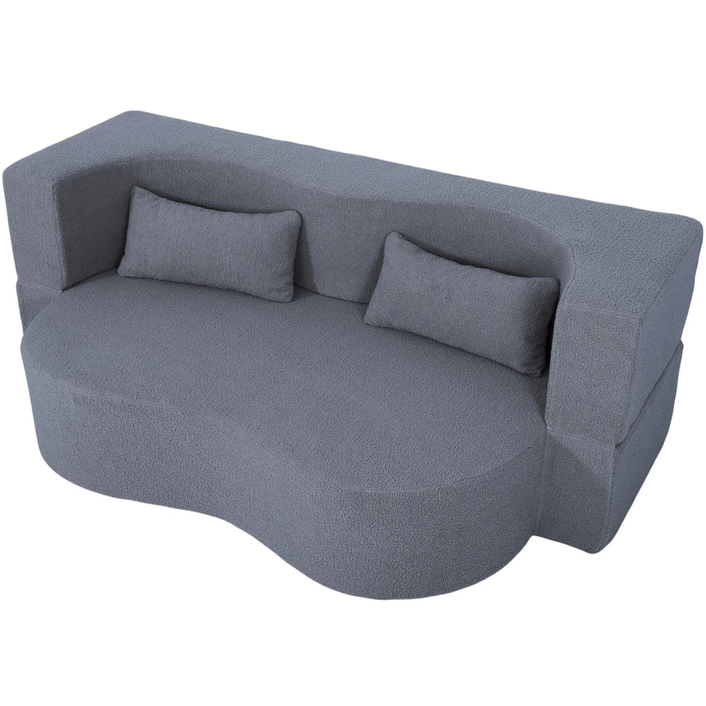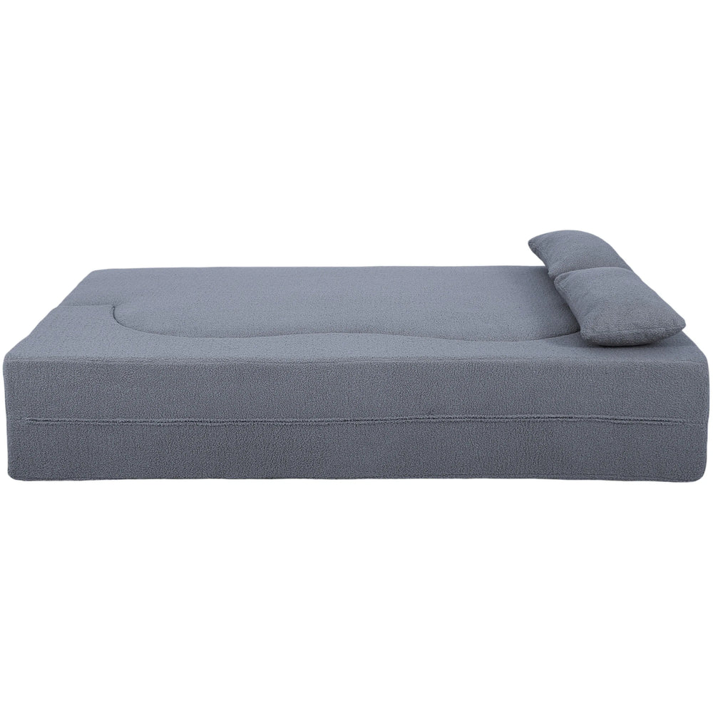 Convertible 2-in-1 sofa bed features soft Teddy fabric upholstery and foam cushioning for warmth and comfort. Easily switches from floor sofa to full-size sleeper with included pillows, ideal for small living spaces, dorms, RVs, and compact rooms.