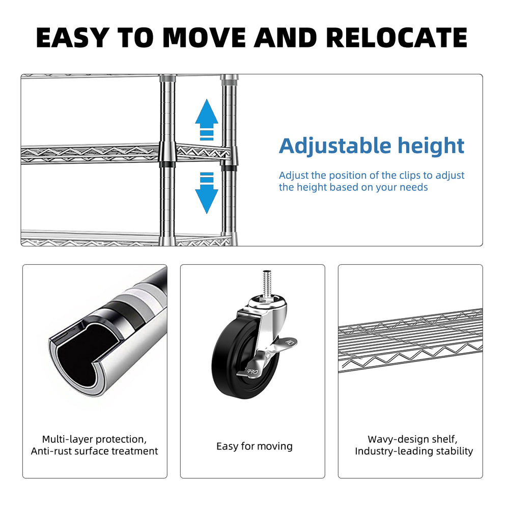 - Adjustable 3-Tier Wire Shelving: Customize shelf heights to fit shoes, folded clothes, and other accessories.