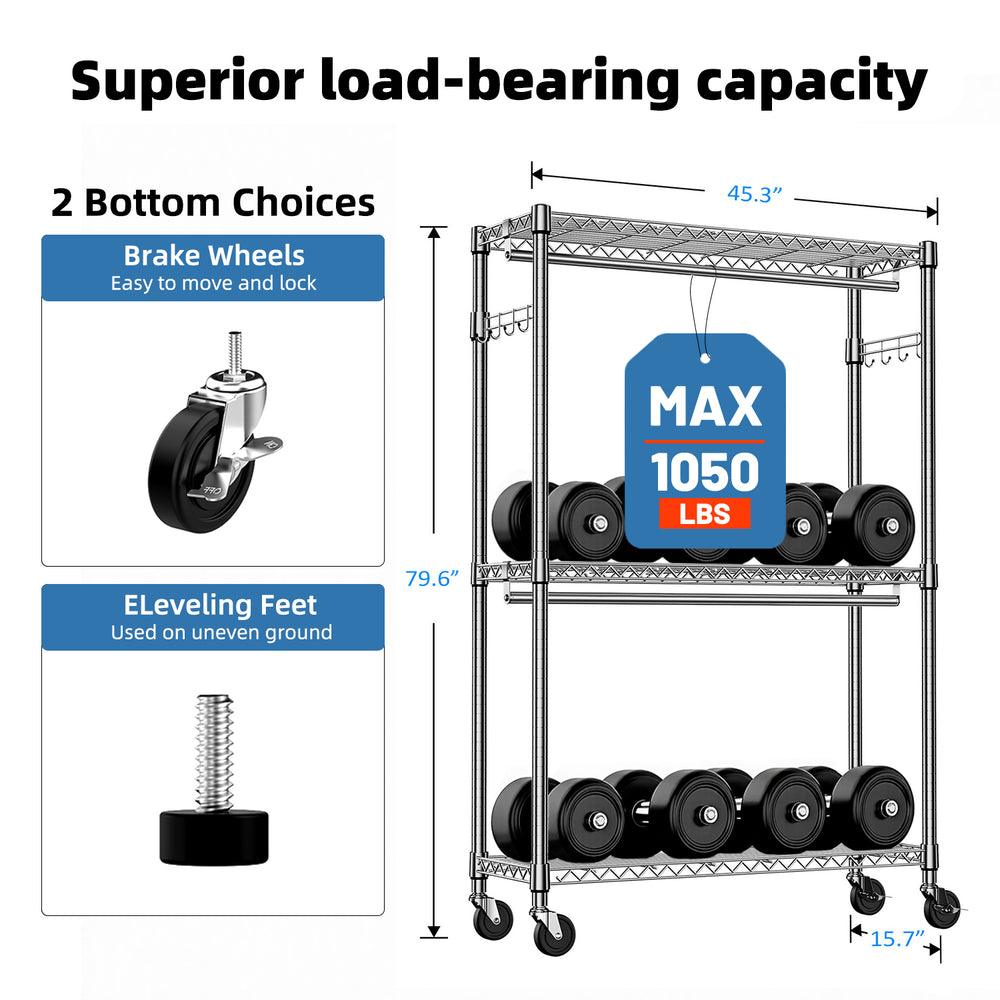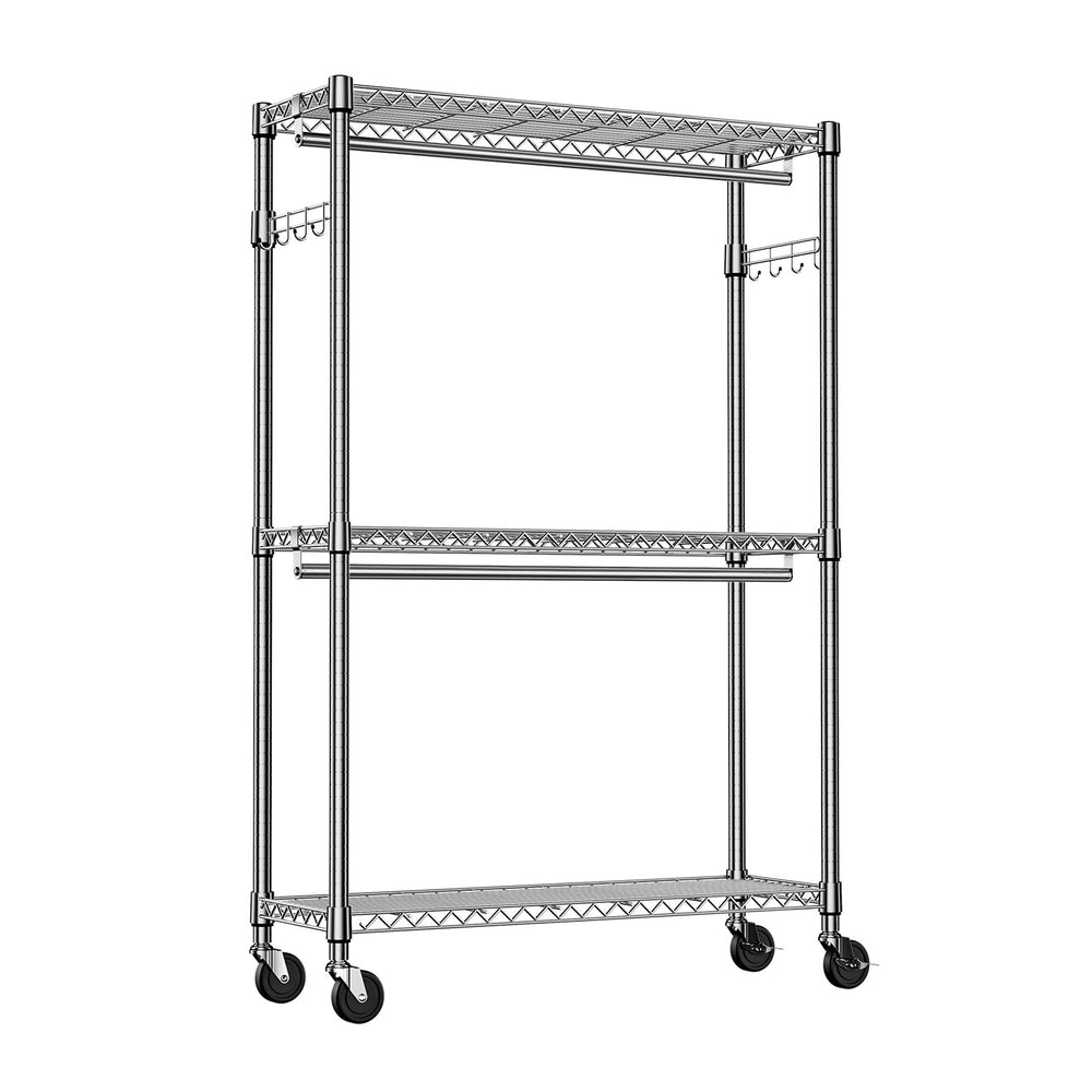 Organize your closet or workspace effortlessly with this modern, heavy duty rolling garment rack. Crafted from premium carbon steel with a durable chrome finish, it offers superior strength and rust resistance for long-lasting use. Featuring three adjustable tiers with two hanging rods and side hooks, this versatile clothes rack accommodates a variety of garments and accessories, from dresses to shoes. The height-adjustable shelves let you customize storage for items of different sizes, keeping everything neat and accessible. Equipped with four smooth 360° swivel wheels—including two lockable casters—this rack moves easily across rooms while remaining secure when locked. Its generous size of 45.3 inches wide, 15.7 inches deep, and nearly 80 inches tall provides ample space without crowding your room. Weighing approximately 27.7 pounds, it balances sturdiness with portability. Ideal for bedrooms, entry closets, and even commercial use, this rolling garment rack streamlines your storage and enhances your organization. Elevate your space and simplify your daily routine today.