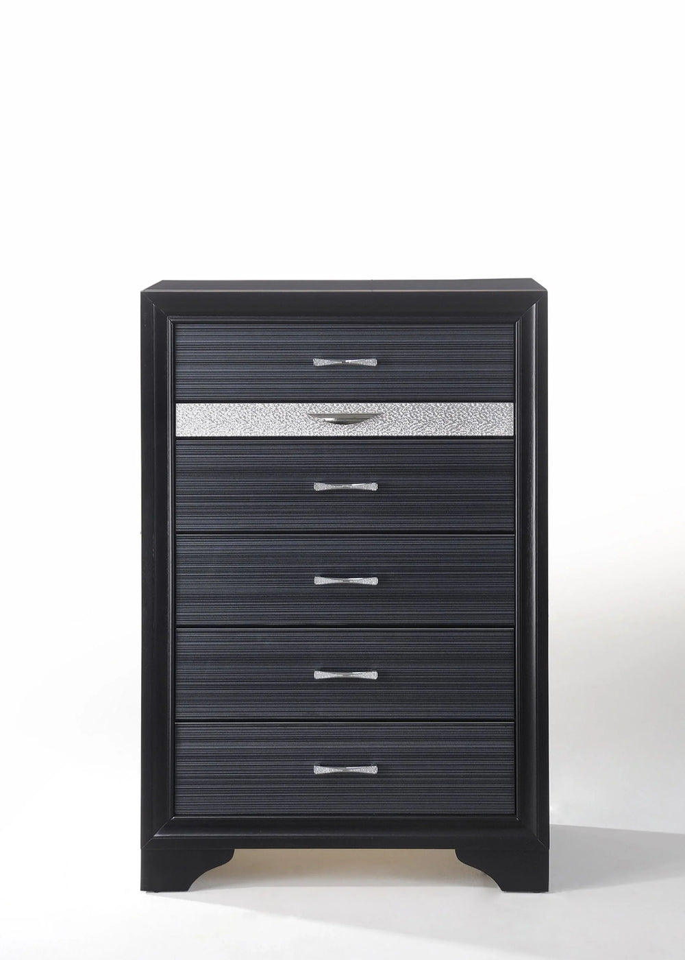 Upgrade your bedroom or living space with the Naima Black Finish Chest, a sleek and functional storage solution crafted from durable synthetic wood. Standing 51 inches tall, this 5-drawer chest features a modern black finish that complements a wide range of décor styles. Designed for optimal organization, it includes a felt-lined jewelry drawer to keep your delicate items secure and accessible. Each drawer glides smoothly on metal center runners with 3/4 extension and built-in safety stops, ensuring effortless access and added convenience. Its vertical design saves floor space while providing ample storage for clothing, accessories, and more. Weighing 115 pounds, this chest promises stability and quality craftsmanship. Elevate your home organization today with this sophisticated, space-smart chest.