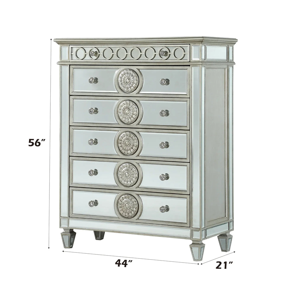 Make a bold statement in any room with the Varian Mirrored Finish Chest. Featuring a dazzling silver mirrored surface, this chest reflects light to enhance the sense of space and brightness in your home. Its intricate geometric trim and sunburst motifs add an artistic flair that transforms ordinary storage into an eye-catching focal point. Crafted from high-quality synthetic wood with mirror inlay, poplar wood, MDF, and plywood, it balances elegance with durability. Six spacious drawers glide smoothly on metal side rails, secured with dovetail English fronts and backs for lasting strength. The top drawer is thoughtfully felt-lined, offering a safe space for delicate valuables while its unfinished rustic interior brings a touch of natural charm. Standing tall on mirrored tapered legs, this chest blends sophisticated style with practical storage, perfect for organizing your belongings with flair. Elevate your interior design and storage solutions today.