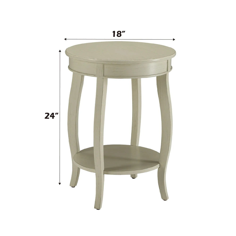 Bring timeless charm and practical storage to any room with the Aberta Antique White Finish Accent Table. Crafted from durable synthetic wood, this elegant table features a classic antique white finish that complements a wide range of décor styles. Its round wooden top and cabriole legs add graceful sophistication, while the open bottom shelf provides convenient storage or display space for books, decor, or essentials. Designed for easy assembly, this compact table measures 18 inches in length and width, and 24 inches in height, making it a perfect fit for cozy corners or beside your favorite seating. With a sturdy build supporting up to 40 lbs on the top and 10 lbs on the shelf, the Aberta accent table combines style and functionality effortlessly. Add a touch of refinement and smart storage to your home—upgrade your décor today.