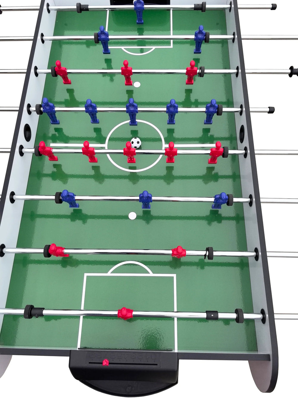 Foosball table with sturdy MDF and steel construction, easy assembly, and adjustable leg levelers. Features a 48"x24"x31" design, suitable for indoor family fun, offices, clubs, and schools. Includes 2 black/white balls for engaging table soccer games.