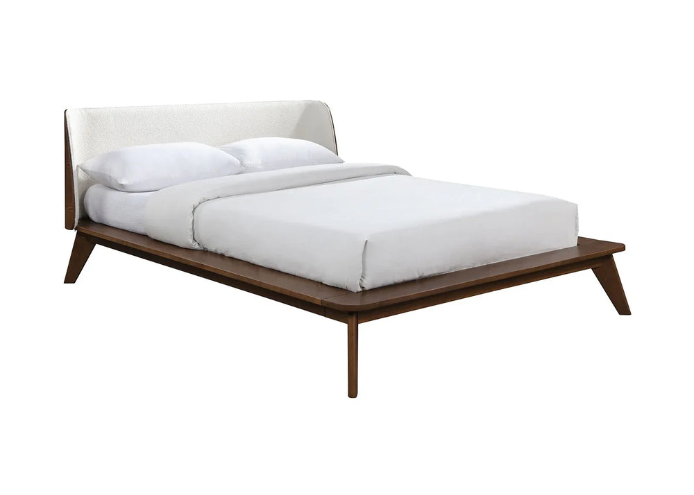 Bring timeless style and sturdy craftsmanship to your bedroom with this walnut and beige full size bed frame. Featuring a fabric-upholstered winged edge headboard, it combines retro mid-century modern charm with transitional appeal. Crafted from solid wood and boucle fabric, this mattress-ready platform bed provides a durable foundation for restful nights without the need for a box spring. The sleek panel headboard and tapered angled legs enhance its clean lines, making it a captivating centerpiece. With dimensions of 57.5 inches wide, 80 inches long, and 33.5 inches high, it perfectly fits a full mattress (not included), offering both comfort and elegant design. Easy to assemble and built to last, this bed frame effortlessly complements a variety of bedroom decors. Elevate your relaxation today with a bed frame that balances comfort, style, and function.