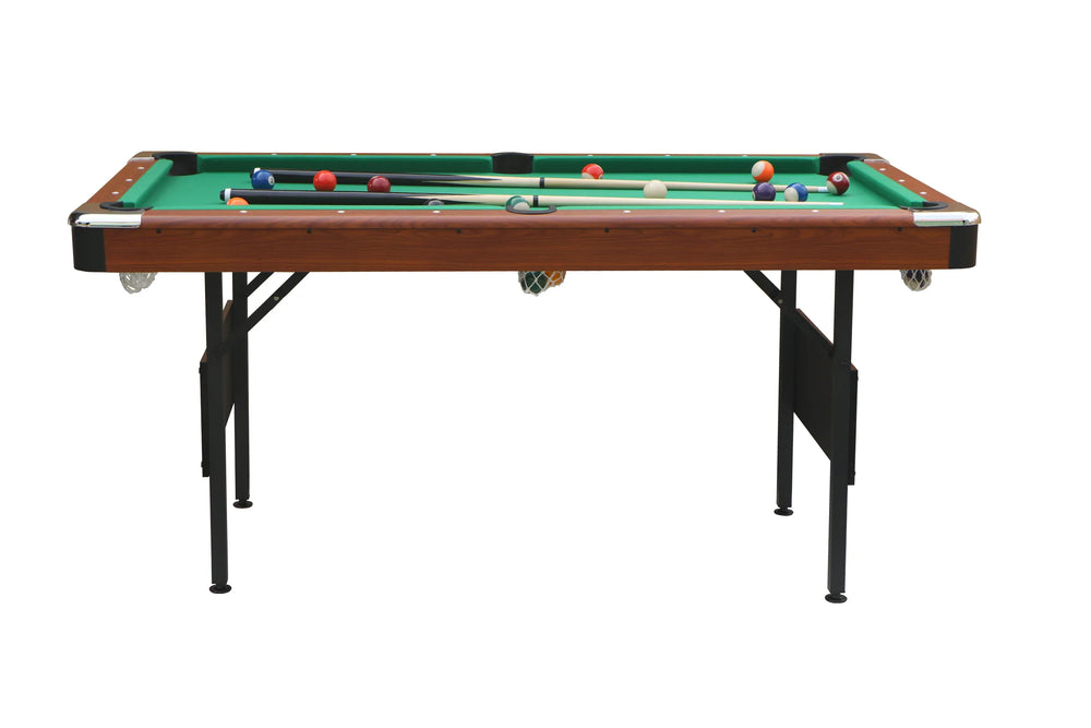 Bring excitement and bonding right into your dining room with this stylish and versatile foldable pool table. Crafted from durable MDF and sturdy steel, its compact size of 63.8”L x 34.3”W x 30.7”H fits perfectly in small spaces while providing a professional 56” x 26.5” blue velvet playfield for smooth, authentic gameplay. Designed with family entertainment and leisure in mind, this game table is easy to assemble, fold, and store, making it an ideal choice for both home and office environments. The elegant green and wood finish blends American and European design, complementing any decor. Complete with all essential accessories, this billiard table invites endless hours of fun, friendly competition, and active family movement. Elevate your indoor entertainment today and create memorable moments with loved ones.