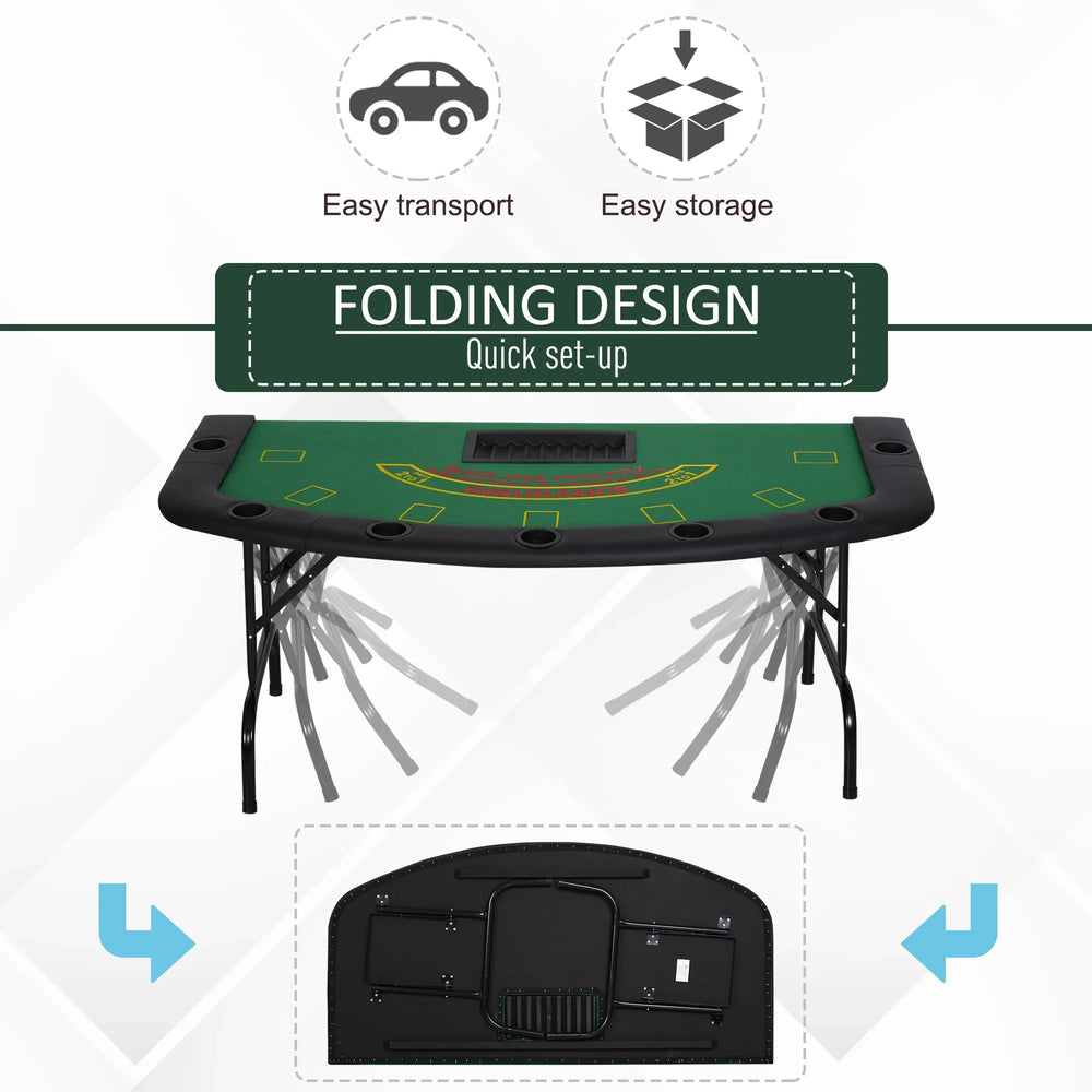This foldable poker table features a professional blackjack layout with card placement areas, seven built-in cup holders, and padded rails for comfortable play. Its compact, half-shape design folds flat for easy storage and portability, ideal for game rooms and casual casino nights.