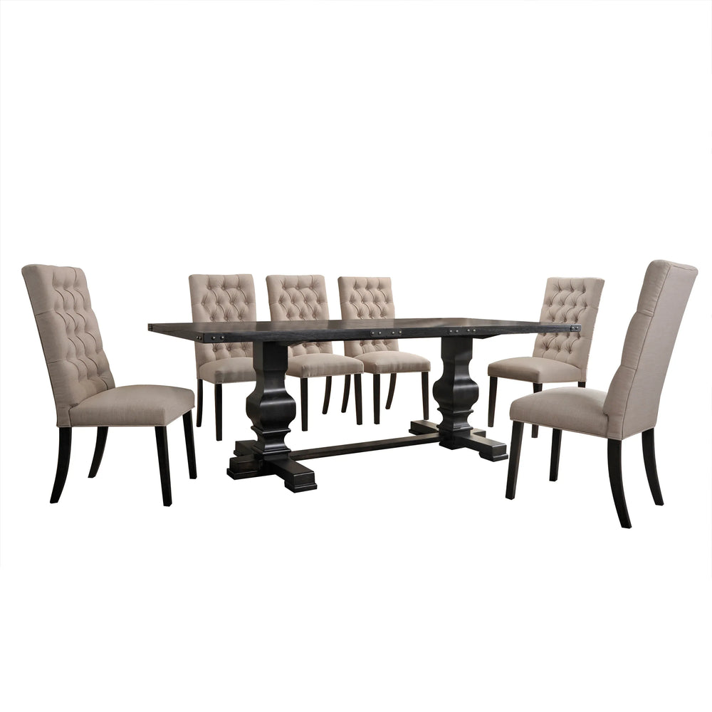 Morland 7-piece dining set features a durable rectangular table with double pedestal base and matching armless Parsons chairs with button-tufted linen upholstery, combining classic design and sturdy synthetic wood construction for elegant, comfortable dining spaces.