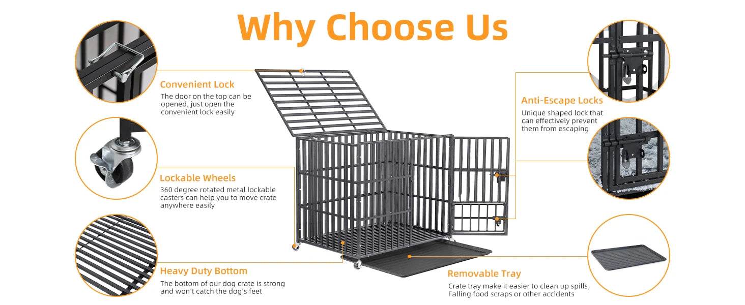 Provide your canine companion with a safe, comfortable, and durable space using this XXL heavy duty dog crate. Crafted from 0.6-inch thickened iron square tube, this chew-resistant kennel withstands even the strongest jaws, ensuring long-lasting toughness for large and aggressive breeds. The spacious interior offers ample room for your dog to stretch and relax, reducing anxiety during confinement. Designed with a triple-door layout—including front, top, and small food doors—this cage offers versatile access options for feeding, interaction, and easy entry. Equipped with a double safety lock system and reinforced welding points, it prevents escape attempts and enhances security. The included removable tray and lockable wheels simplify cleaning and portability, making this cage practical for both training and daily use. Elevate your dog's comfort and safety today with this premium heavy duty kennel.