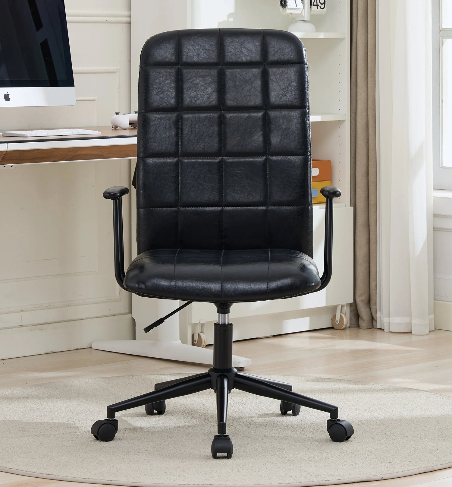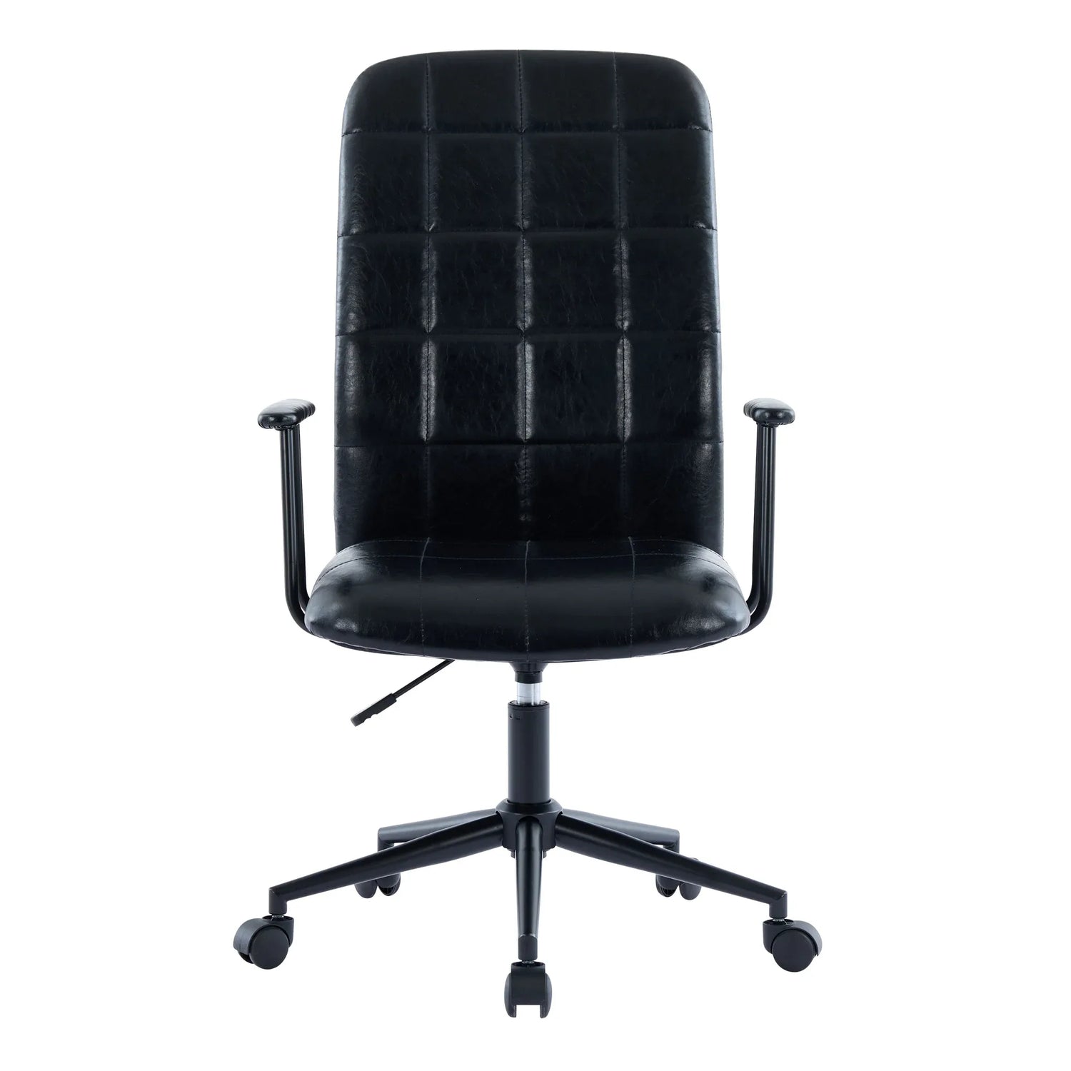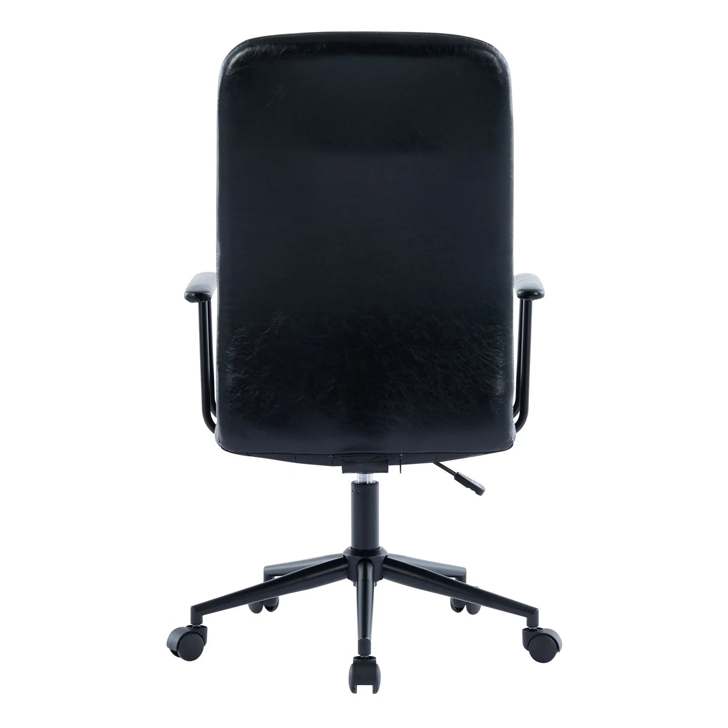 Enhance your workspace with this elegant office chair featuring antique black PU leather upholstery that blends style and durability. Designed for all-day comfort, it includes a high backrest and soft foam seating to support your posture and reduce fatigue. The 360-degree swivel and smooth-rolling black wheels offer effortless mobility, while the gas lift allows easy seat height adjustment between 18.3 and 22 inches, accommodating various desk setups. Its sturdy metal frame with a black powder-coated finish ensures stability and long-lasting performance, while the five-star base adds safety and balance. Perfectly sized at 23.2 inches long by 26.4 inches wide and 42.1–46.1 inches tall, this chair combines functionality with timeless design. Elevate your productivity and comfort today.