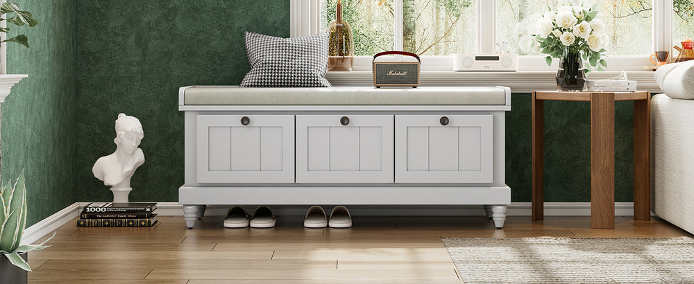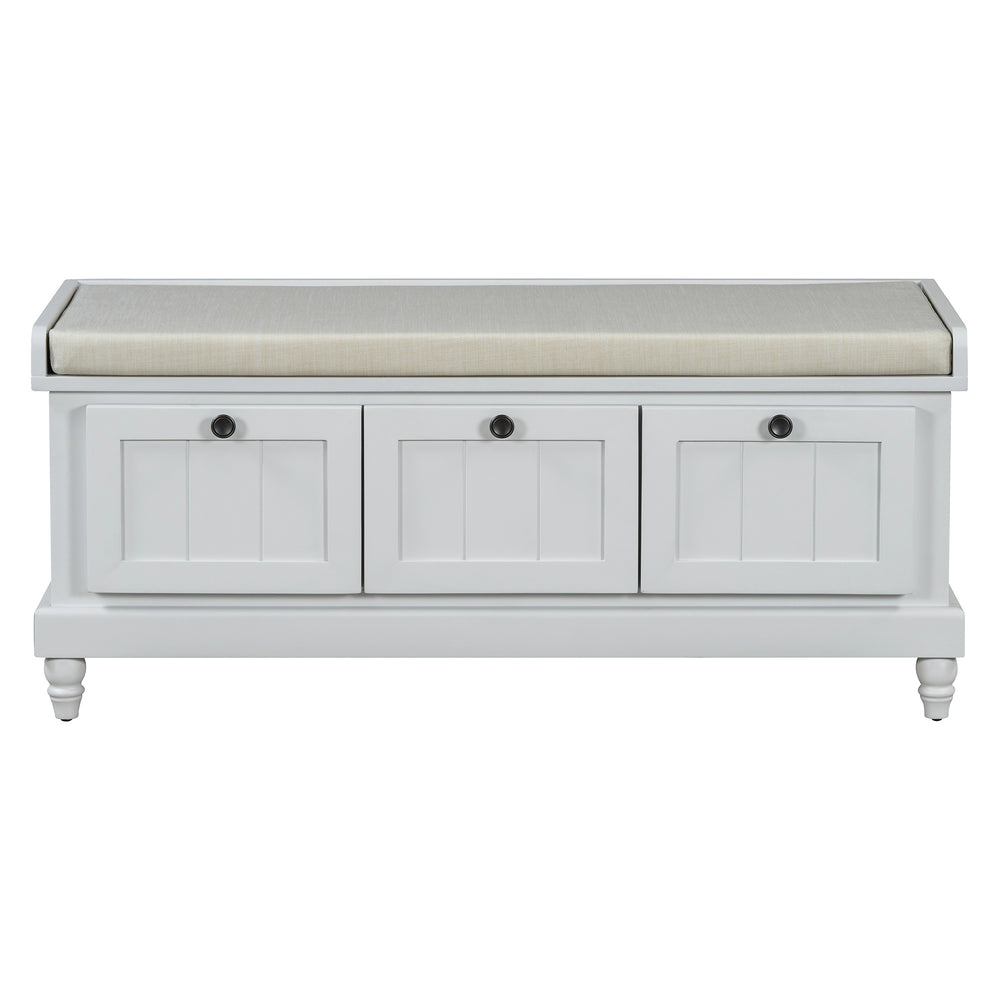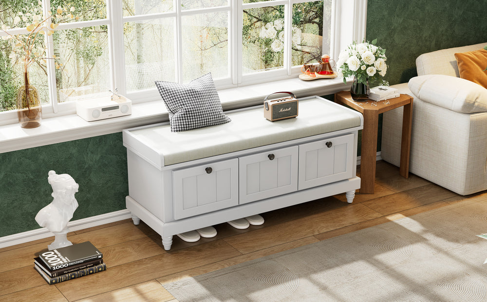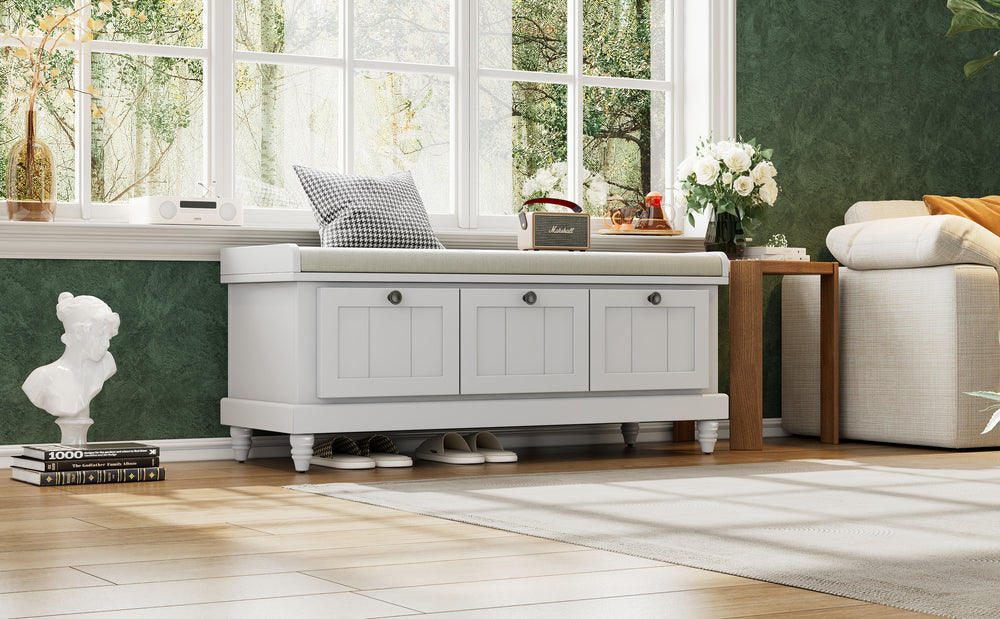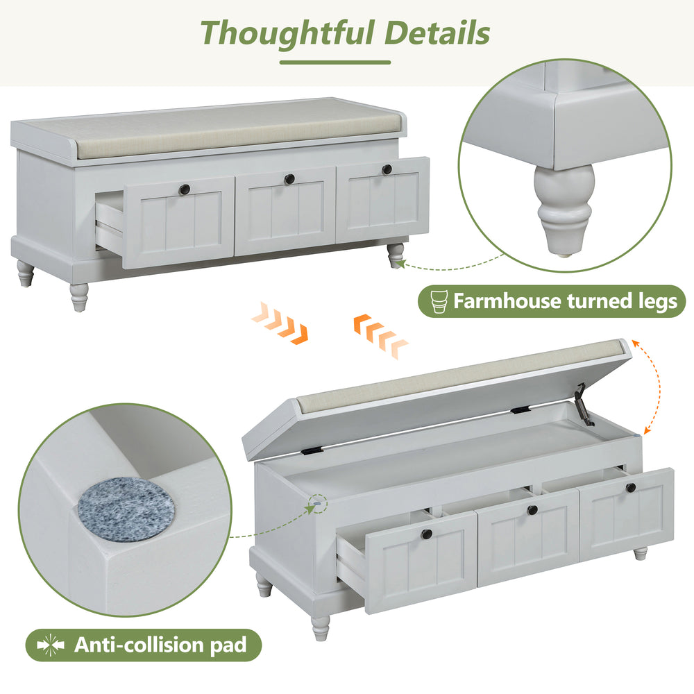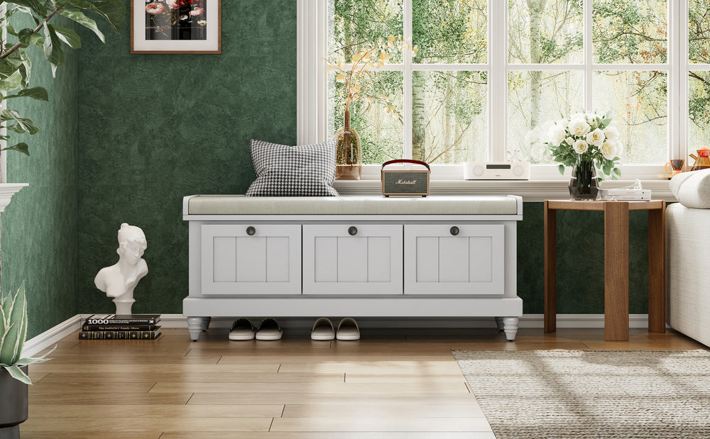 Bring both style and functionality to your living space with the TREXM Classic Shoe Bench. Crafted from durable MDF and rubber wood, this light gray entryway bench features a soft cushioned seat for comfortable seating while putting on shoes or relaxing. Its timeless design with fluted doors and round handles blends vintage charm with modern simplicity, perfectly complementing various decor styles. Three spacious drawers and a hidden storage compartment under the seat provide ample organization for shoes, toys, blankets, and everyday essentials, keeping your entryway clutter-free. The plush cushion also includes a soft pad to prevent lid slamming, ensuring quiet and secure use. Sturdy farmhouse-turned legs add rustic elegance and durability. Elevate your home’s entryway with this versatile storage bench today.
