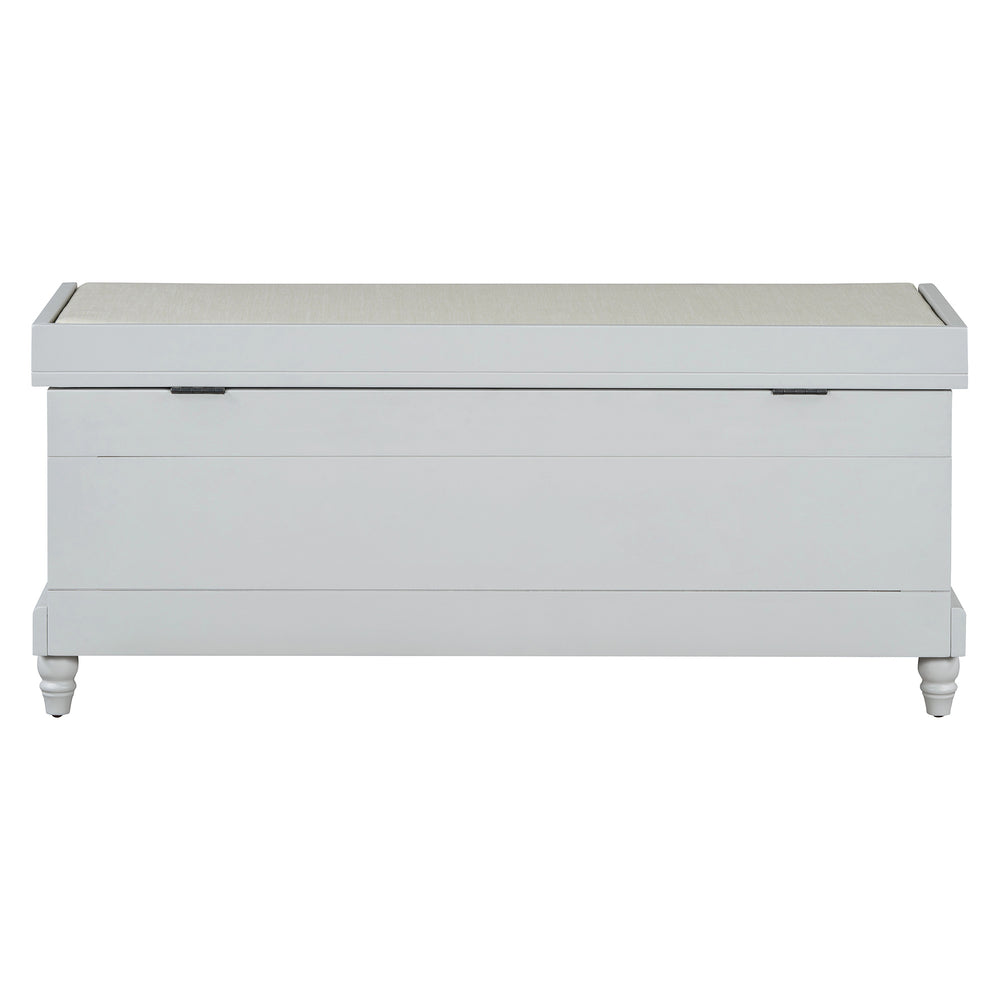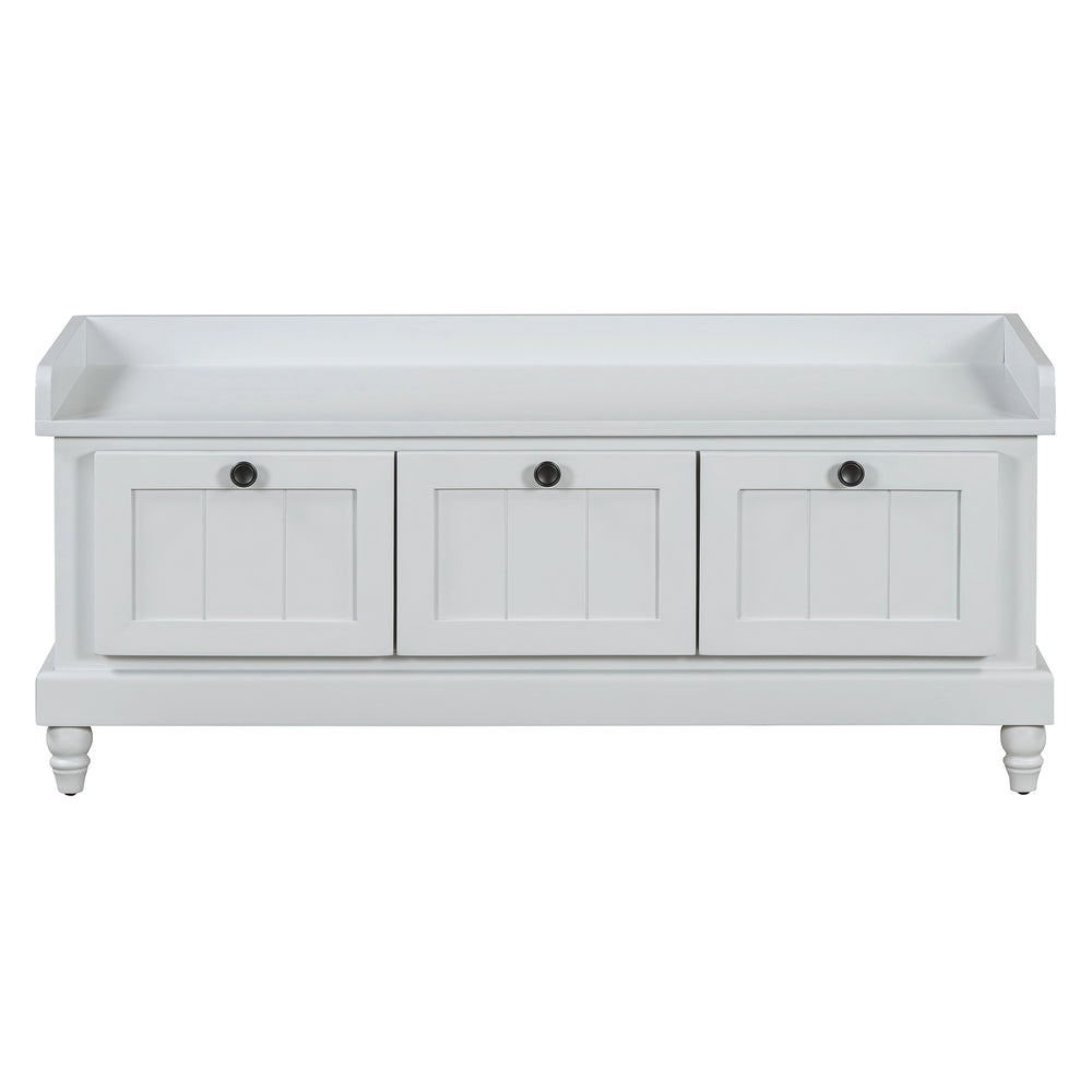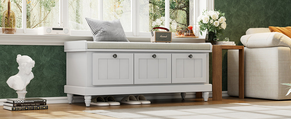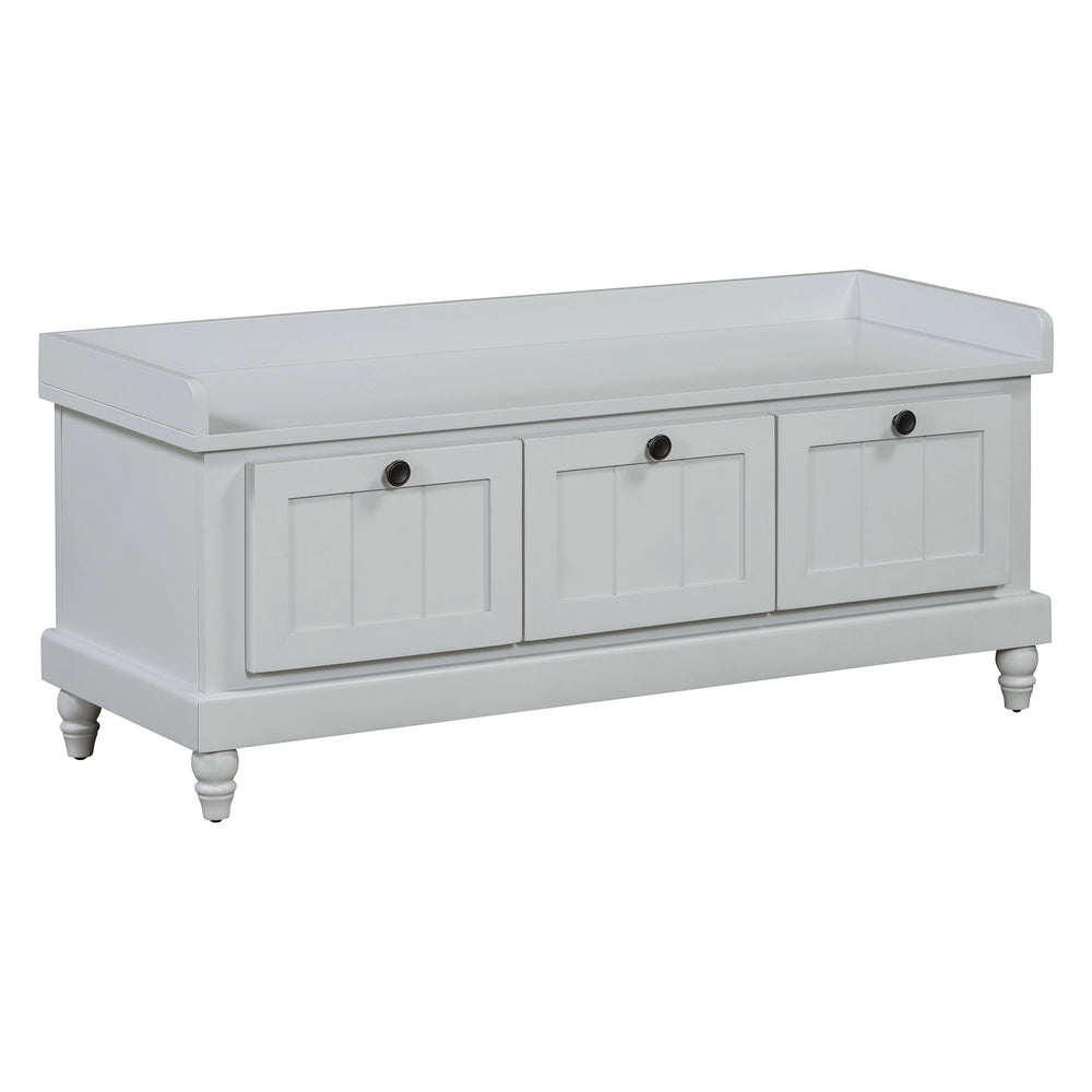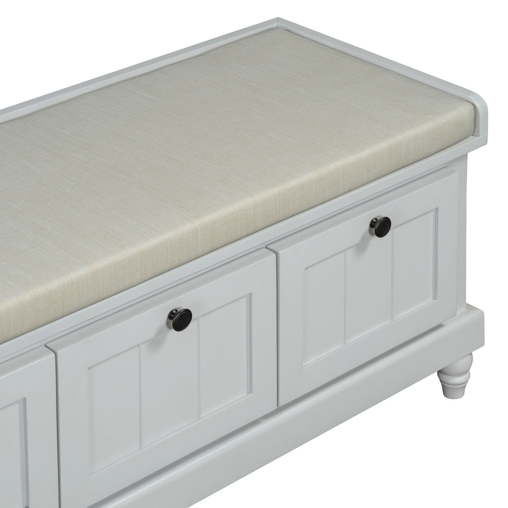Bring both style and functionality to your living space with the TREXM Classic Shoe Bench. Crafted from durable MDF and rubber wood, this light gray entryway bench features a soft cushioned seat for comfortable seating while putting on shoes or relaxing. Its timeless design with fluted doors and round handles blends vintage charm with modern simplicity, perfectly complementing various decor styles. Three spacious drawers and a hidden storage compartment under the seat provide ample organization for shoes, toys, blankets, and everyday essentials, keeping your entryway clutter-free. The plush cushion also includes a soft pad to prevent lid slamming, ensuring quiet and secure use. Sturdy farmhouse-turned legs add rustic elegance and durability. Elevate your home’s entryway with this versatile storage bench today.