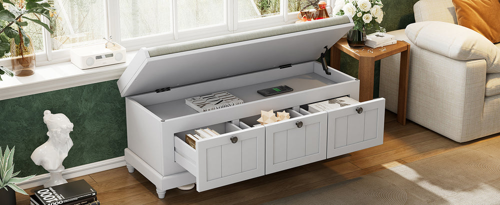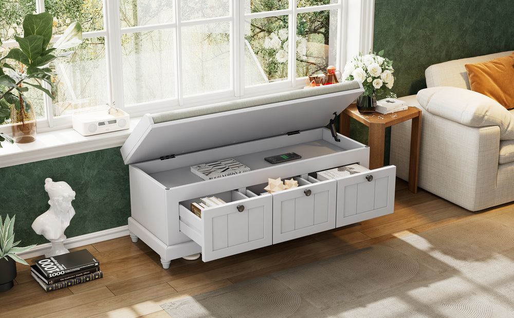 Classic storage bench with cushioned seat offers comfortable seating and rustic charm, featuring three drawers plus hidden storage for organizing essentials. Made from durable MDF and rubber wood, ideal for entryways, bedrooms, or living rooms with vintage-modern style.