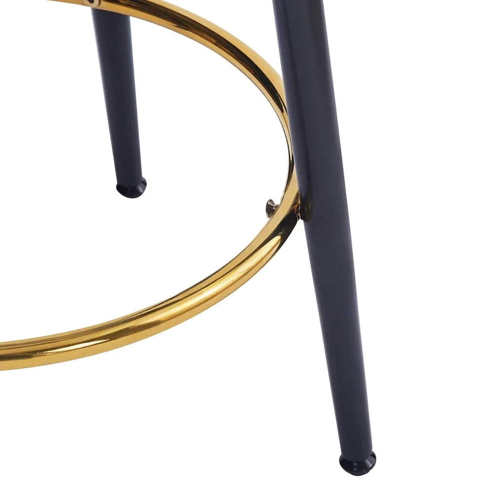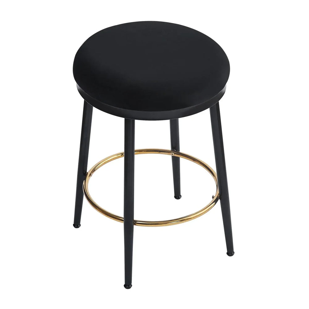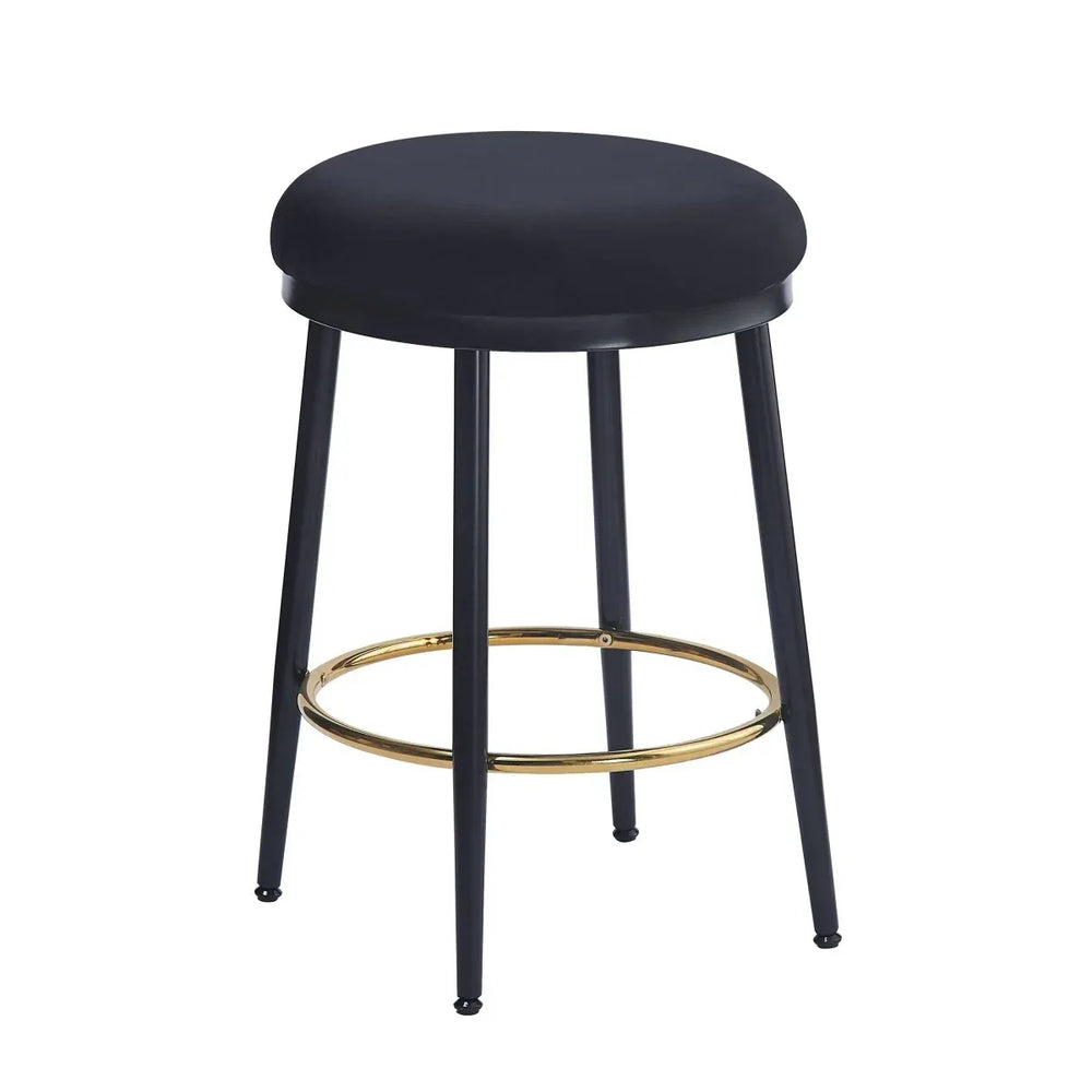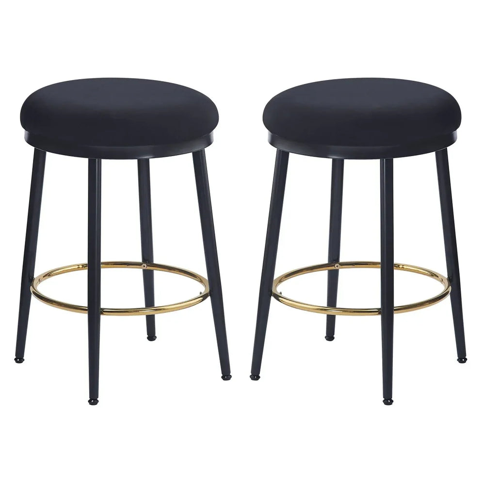 Upgrade your kitchen, dining room, or bedroom with this stylish set of two modern counter stools. Featuring a sleek black velvet fabric seat and sturdy iron frame, these stools combine elegance with durability. The round seat is generously padded with sponge foam cushions to provide comfortable seating for extended use. A golden-metal circular footrest enhances both support and style, while the backless design allows easy movement and versatile placement. Compact at 16.5 by 16.5 inches wide and 24.75 inches tall, these stools fit perfectly in a variety of spaces. With adjustable plastic floor protectors, enjoy stable seating even on uneven surfaces. Whether you need extra seating for guests or an elegant footrest, these counter stools deliver lasting comfort and modern flair. Elevate your home seating experience today.