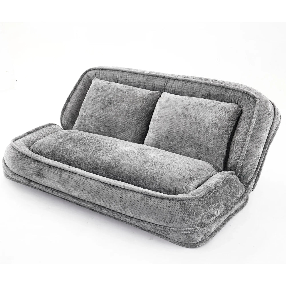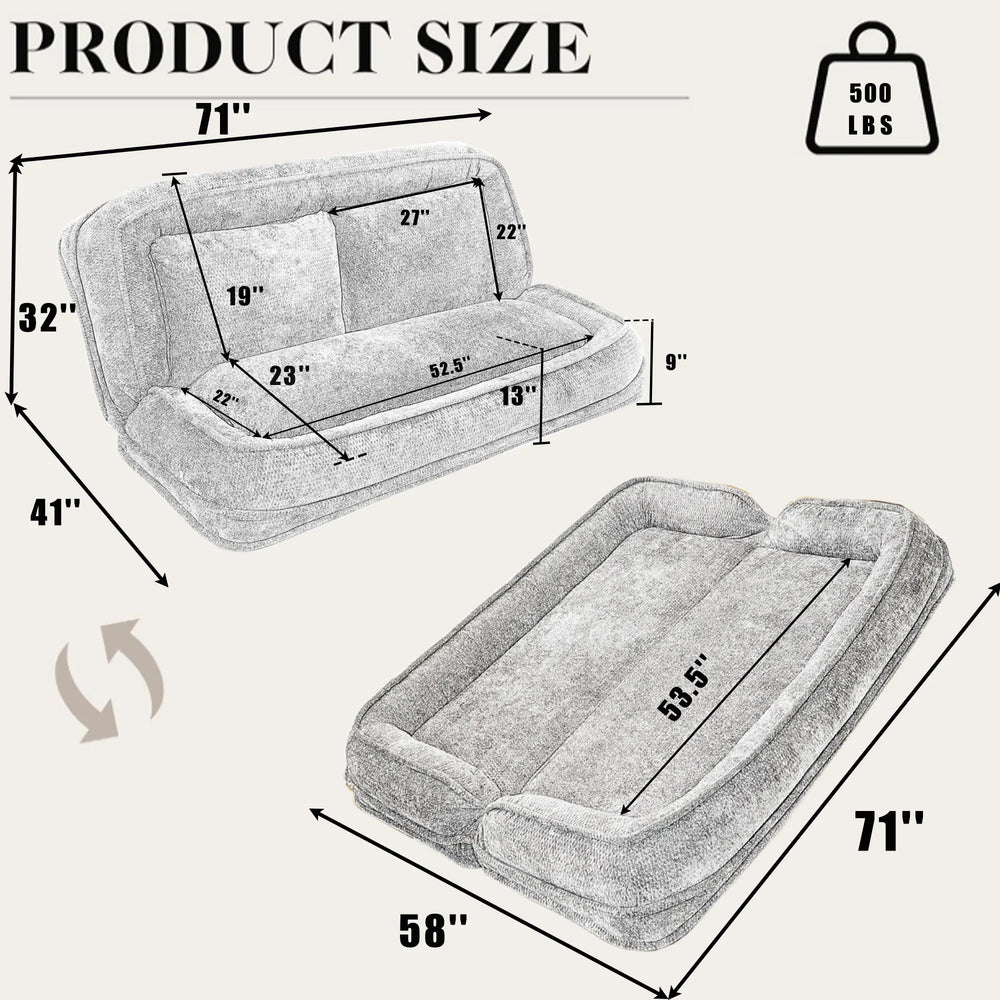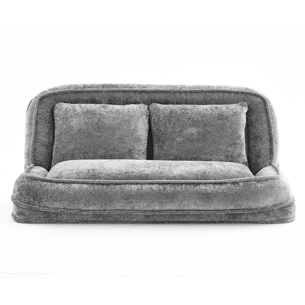 Relax and unwind on this versatile lazy sofa that seamlessly transforms from a loveseat into an extra-large floor couch, perfect for you and your pets. Upholstered in soft, durable chenille fabric with fiber foam padding, it offers medium-soft seating comfort and stylish modern appeal. The sturdy metal frame supports up to 500 lbs and features a multi-gear adjustable backrest with five locking positions, allowing you to sit upright or recline flat for a restful nap or movie night. Measuring 71 inches long, 41 inches wide, and 32 inches high, this convertible sofa brings cozy functionality to any living space. Its armless design and plush cushions create a warm, inviting area to read, watch TV, or relax together. Easy to assemble from a vacuum-sealed pack, this human dog bed loveseat is an ideal choice for shared comfort. Elevate your living room experience today with this innovative 2-in-1 lazy sofa.
