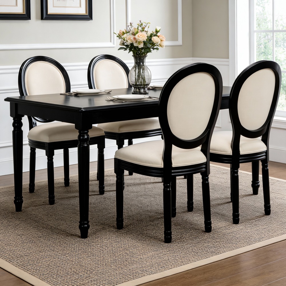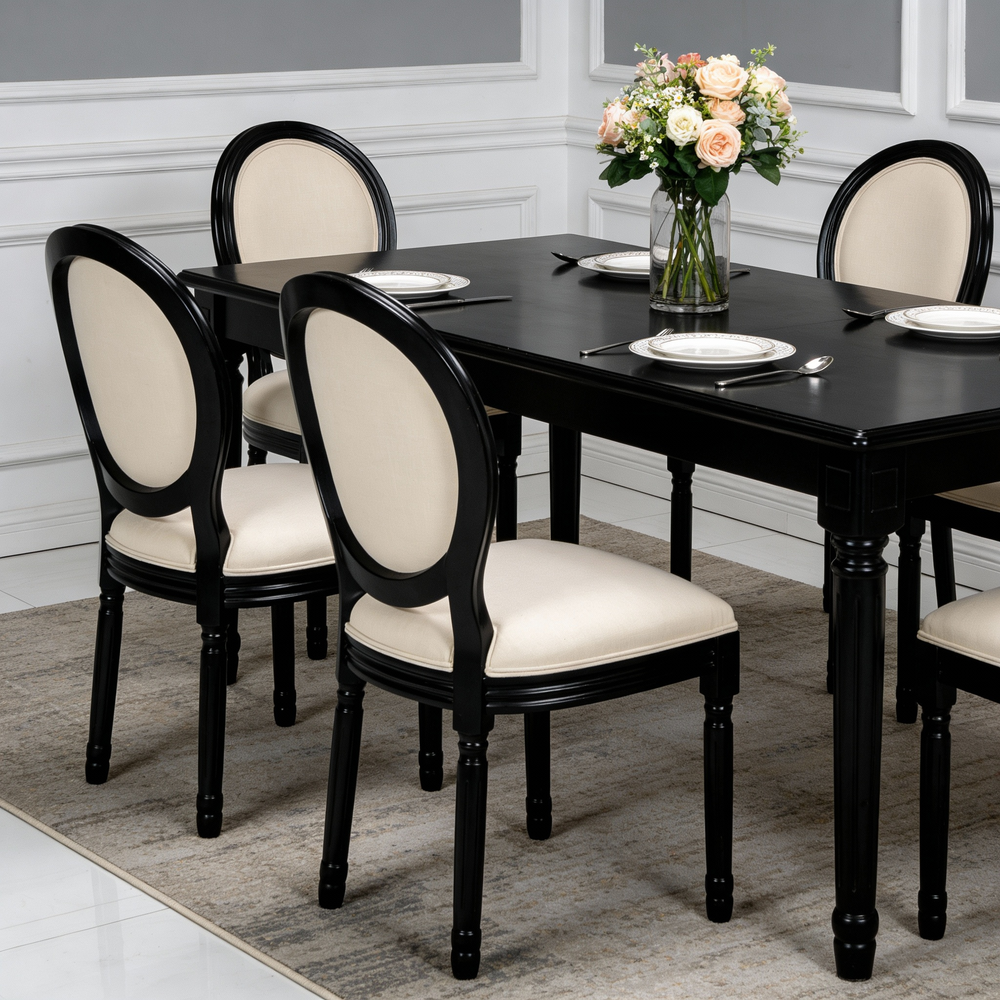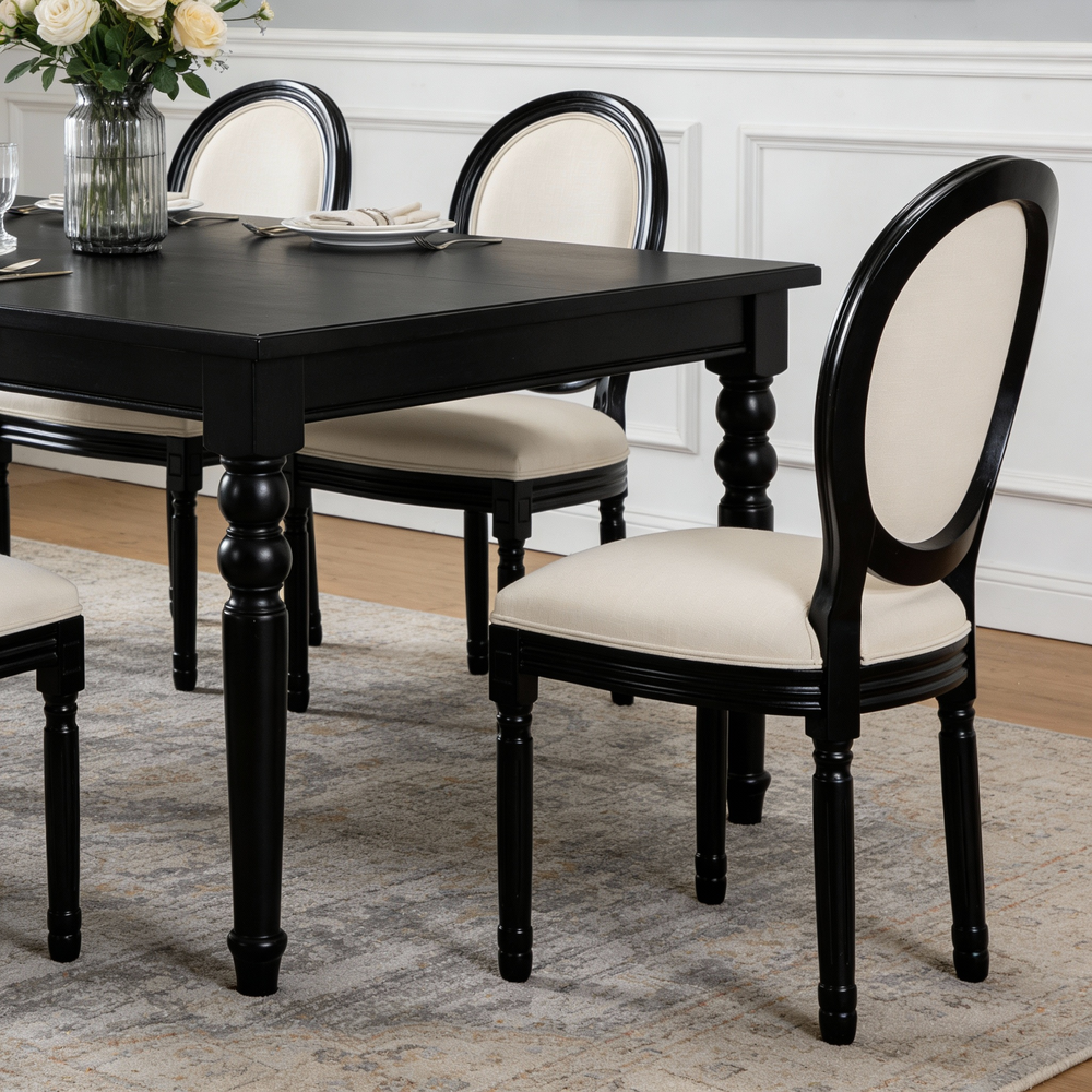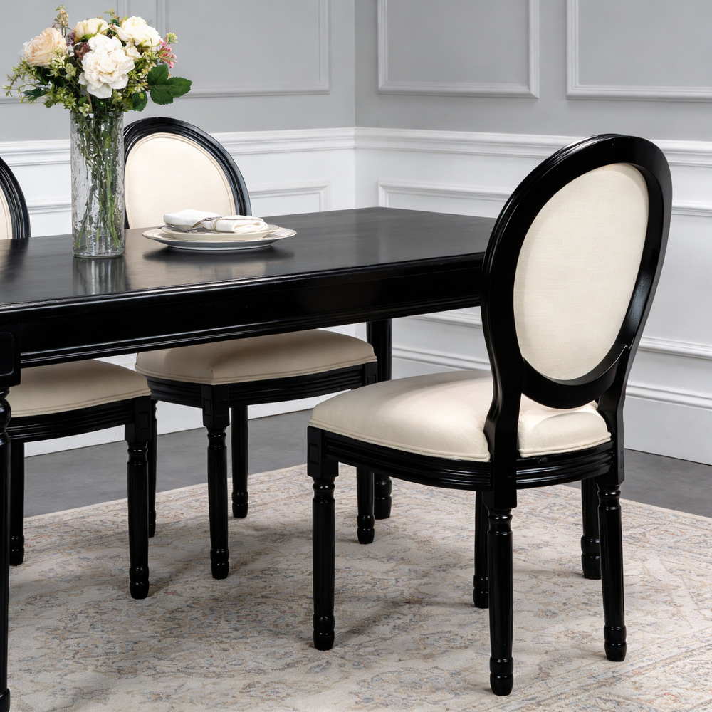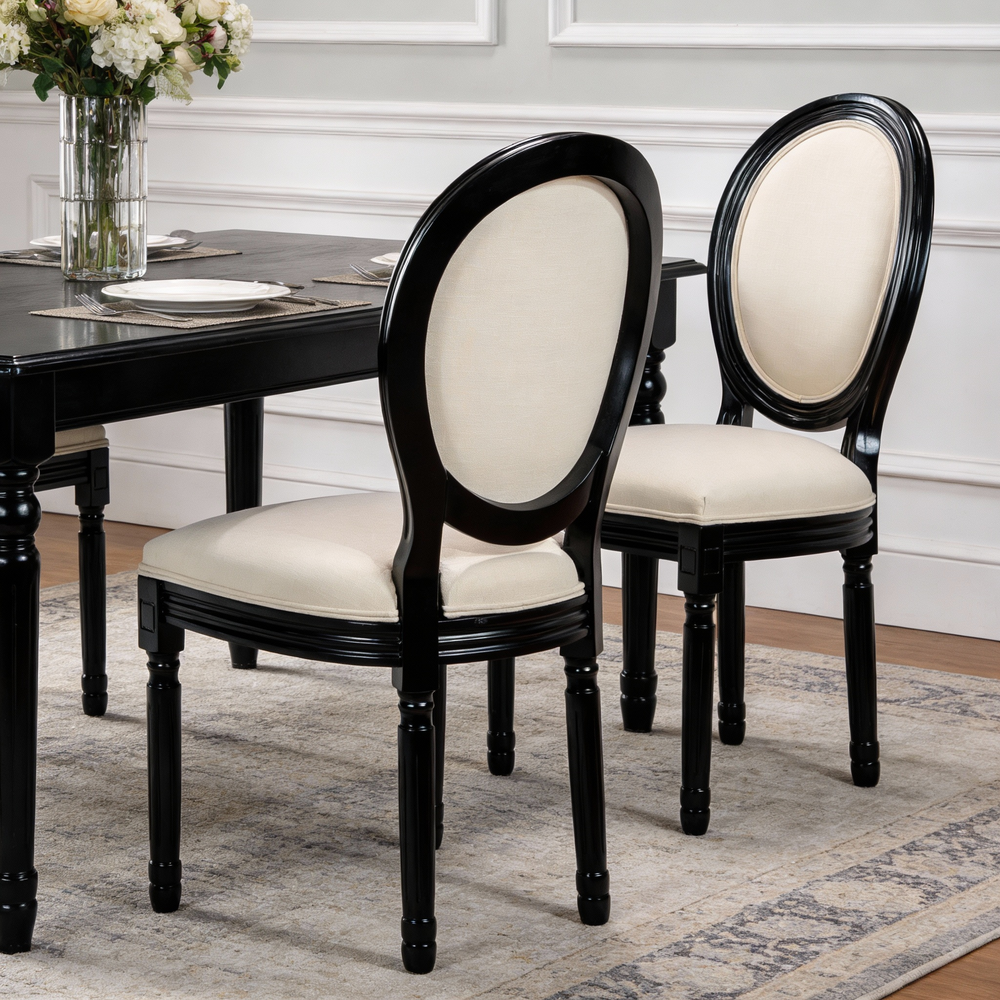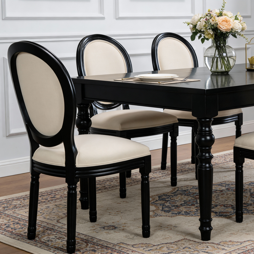 Enhance your living room, kitchen, or restaurant space with these beautifully crafted French Country dining chairs. Upholstered in soft, durable beige cotton linen fabric, they offer both comfort and style. The sponge-padded round back combined with wire drawing and intricate carving techniques provides a classic charm that complements any décor. Featuring a sturdy solid wood frame and a sleek black finish, these chairs ensure long-lasting stability and support. Designed for easy assembly and disassembly, they save space while allowing flexible use in your home or commercial settings. Perfect for cozy dinners or stylish gatherings, these chairs add a refined touch of vintage French charm to your space. Elevate your dining experience today.