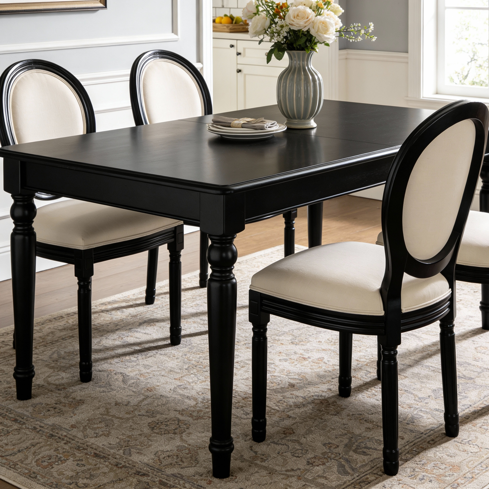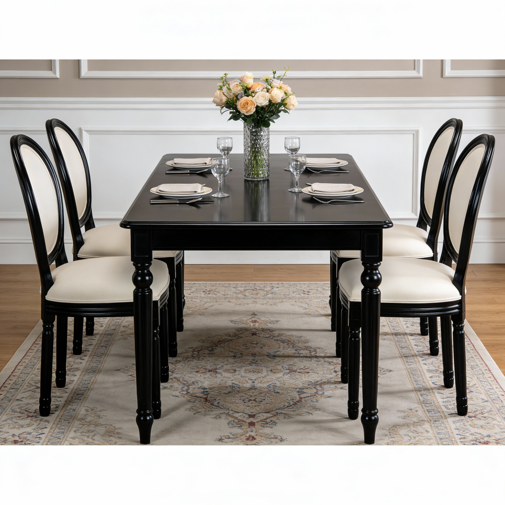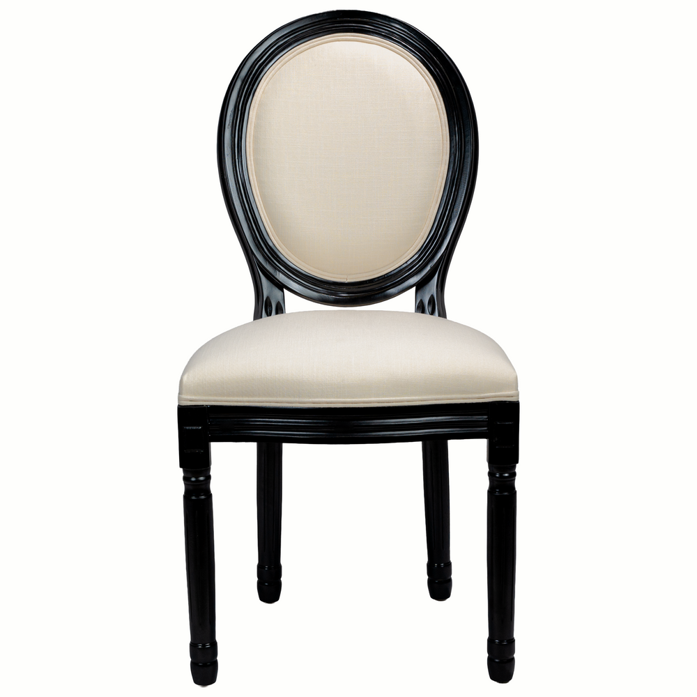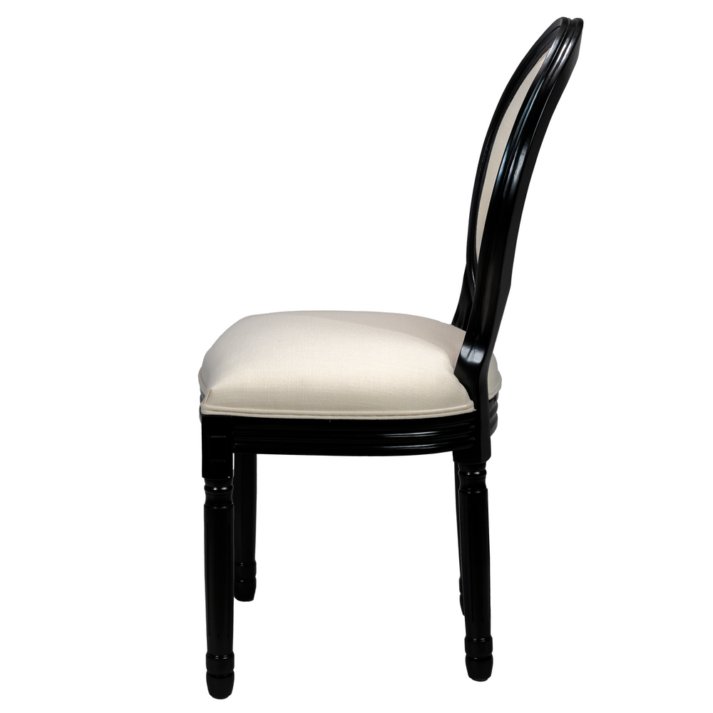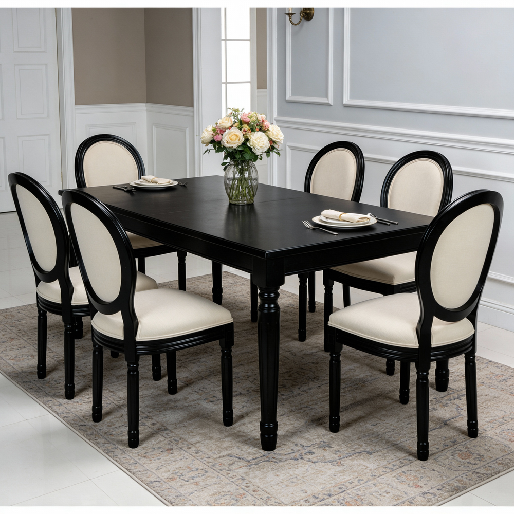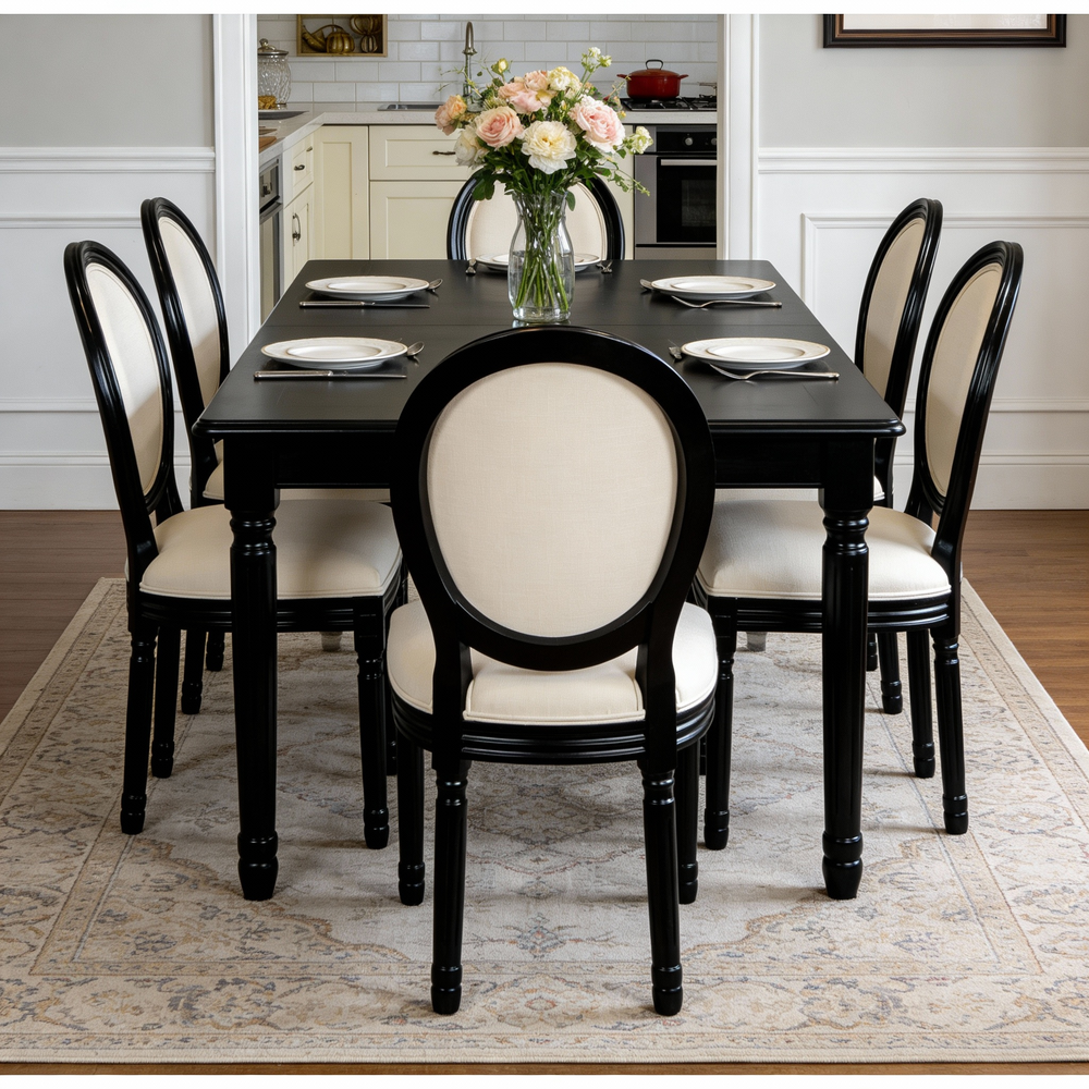 Enhance your living room, kitchen, or restaurant space with these beautifully crafted French Country dining chairs. Upholstered in soft, durable beige cotton linen fabric, they offer both comfort and style. The sponge-padded round back combined with wire drawing and intricate carving techniques provides a classic charm that complements any décor. Featuring a sturdy solid wood frame and a sleek black finish, these chairs ensure long-lasting stability and support. Designed for easy assembly and disassembly, they save space while allowing flexible use in your home or commercial settings. Perfect for cozy dinners or stylish gatherings, these chairs add a refined touch of vintage French charm to your space. Elevate your dining experience today.