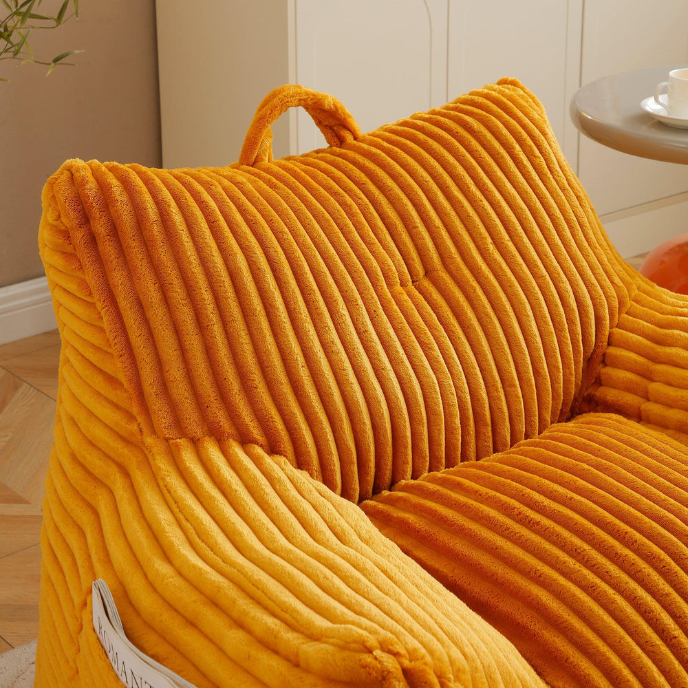 Modern bean bag chair with corduroy cover and high-resilience shredded foam filler offers medium-soft plushness and ergonomic support with armrests and footstool, ideal for lounging, reading, or gaming in primary living spaces with durable, anti-slip design.