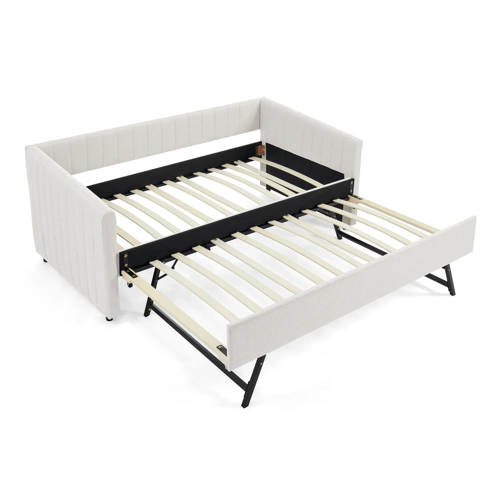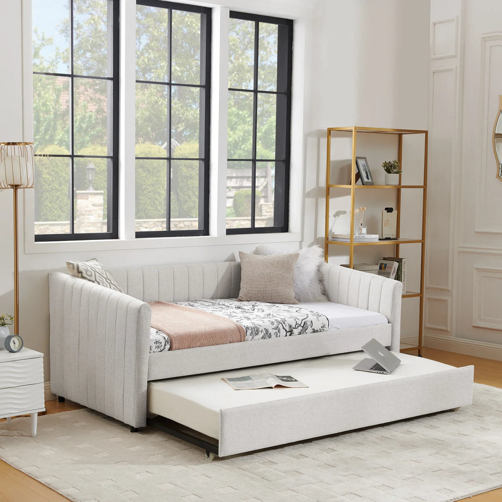 This twin size daybed offers the perfect blend of style and functionality for your bedroom or living space. Upholstered in breathable beige linen fabric enhanced with elegant vertical stripes, it brings a refined designer look while staying soft and cool for extended comfort. The foam-padded sides and backrest provide ergonomic support for sitting or lounging. Beneath the sturdy frame lies a convenient trundle bed that easily pulls out to create extra sleeping space, ideal for guests or family. Constructed with durable plywood, MDF, and foam, this daybed supports up to 500 pounds, ensuring lasting stability. With easy assembly and a timeless design, this multi-use upholstered sofa bed is a smart solution to maximize small rooms or add flexible seating and sleeping options. Elevate your home comfort today with this stylish and practical twin size daybed.