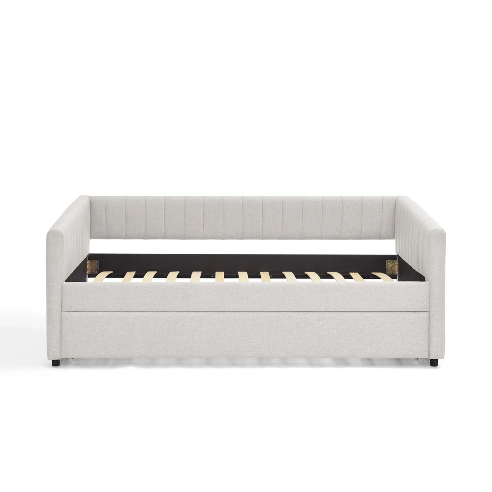 Twin-size daybed upholstered in breathable beige linen with foam-padded sides and back for ergonomic support and comfort. Features a stylish vertical stripe design and functional trundle for extra sleeping space. Ideal for bedrooms, offering easy assembly and up to 500lbs weight capacity.