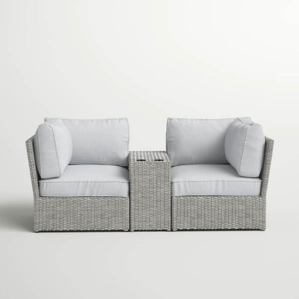 Upgrade your outdoor living space with this fully assembled 3-piece patio sofa set, designed for comfort and style. Featuring two corner sectional units that create a cozy loveseat, along with a convenient side table equipped with dual cup holders, this seating group is perfect for patio, porch, or balcony conversations. The weather-resistant aluminum frame wrapped in durable HDPE wicker withstands all seasons, while the plush gray olefin cushions—filled with high-density foam—offer lasting support and comfort. Easy-care removable cushion covers make maintenance simple, ensuring your outdoor sofa stays fresh and inviting. At just 77 pounds, this set is sturdy yet portable, providing effortless elegance and function without any assembly. Elevate your outdoor relaxation today.