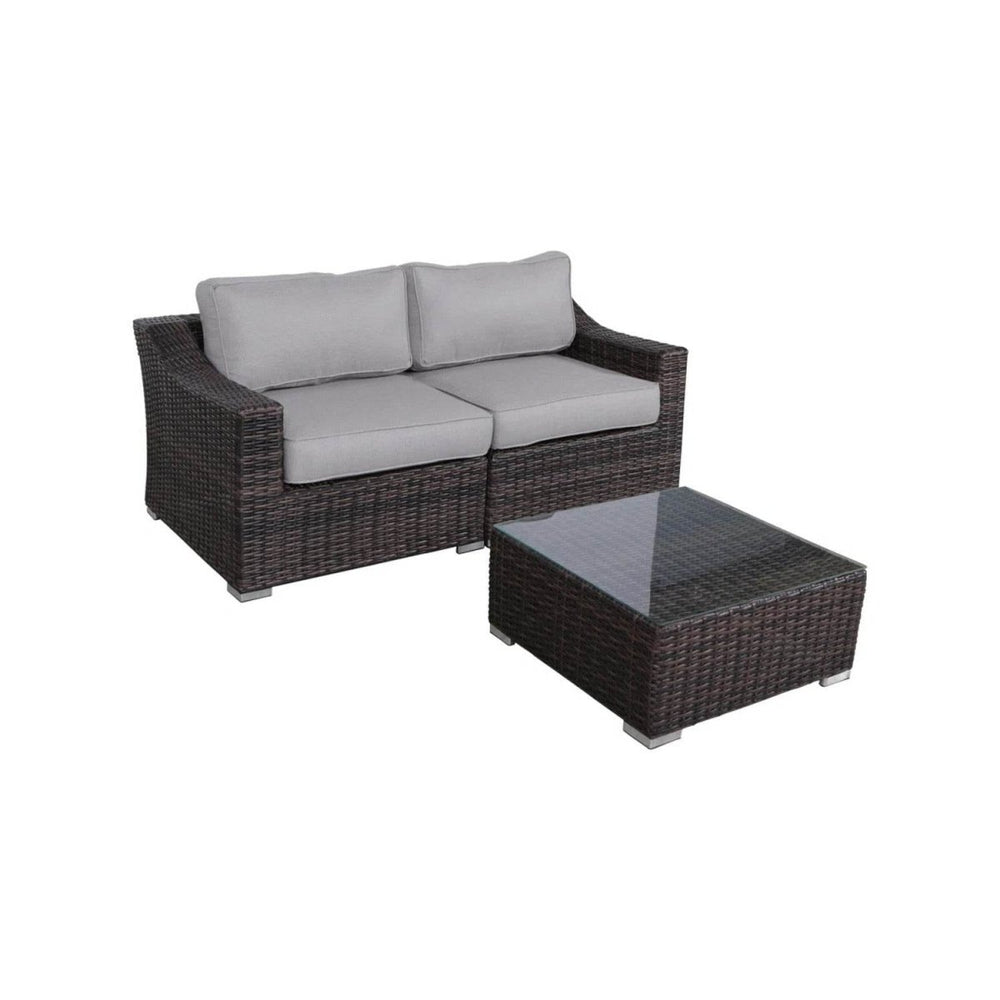 Fully assembled 3-piece modern outdoor sectional seating group with loveseat, tempered glass coffee table, and four water-resistant foam cushions. Features UV-resistant wicker and rust-proof aluminum frame for durable garden or patio relaxation. Ideal for intimate outdoor spaces with low-maintenance care.