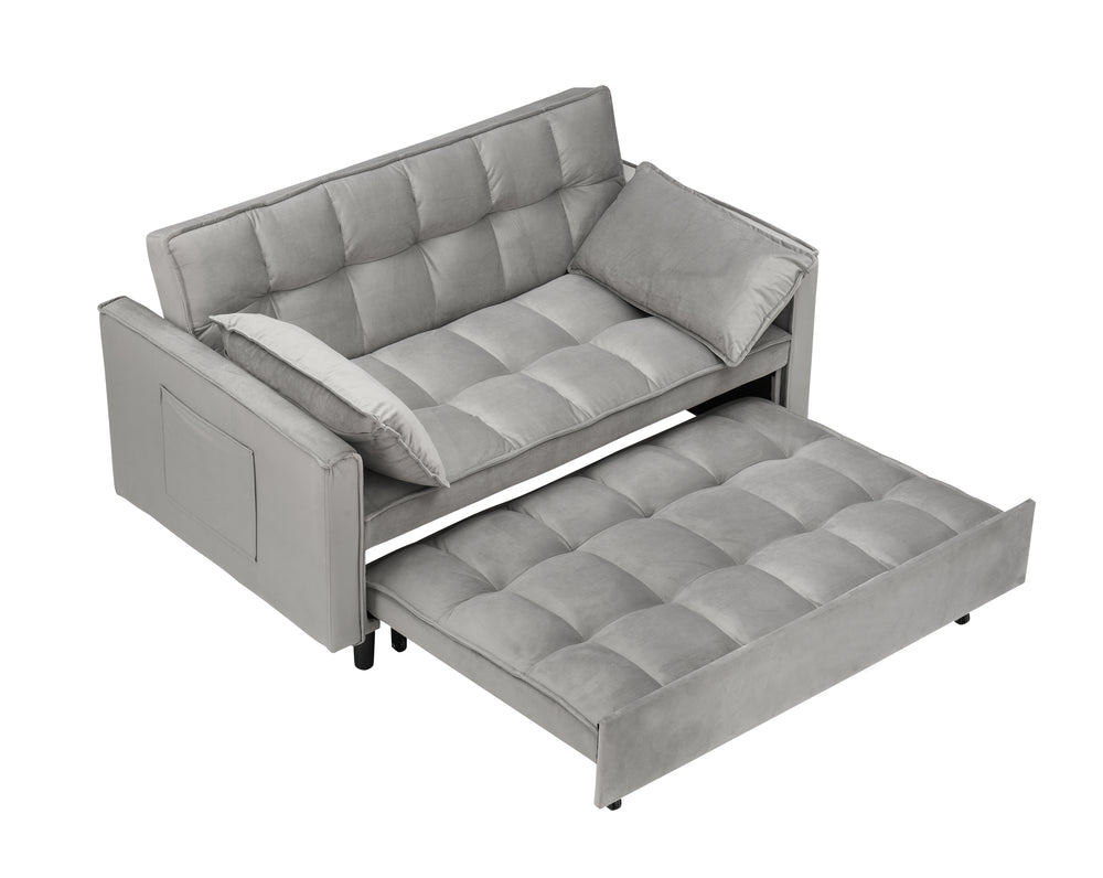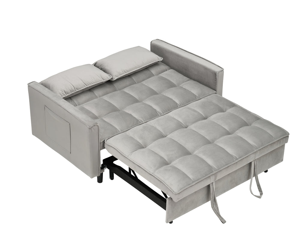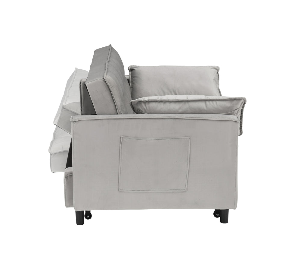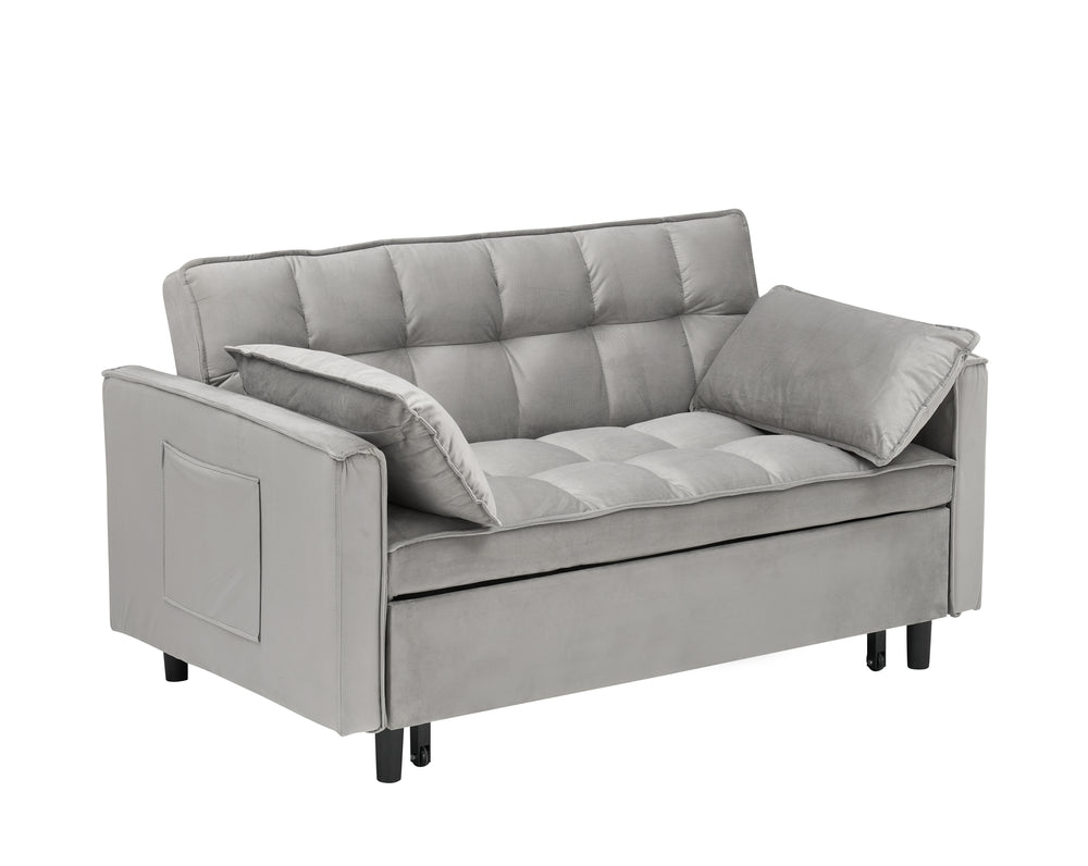 Enhance your living space with this elegant 3-in-1 convertible loveseat futon, perfect for small spaces and versatile living. Upholstered in soft velvet fabric, this loveseat offers a cozy seating experience for two with plush sponge cushions and a curved backrest that supports your back and waist health. Easily transition from a loveseat to a lounge chair or pullout bed, making it ideal for guest rooms, kids’ rooms, or compact living areas. The sleek gray tone blends effortlessly with modern, Nordic, or industrial décor styles, adding subtle sophistication and comfort. Thoughtfully designed with toss pillows and storage pockets, this loveseat brings both function and flair. With solid wood framing and suede-like velvet, it promises lasting durability and style for everyday relaxation. Elevate your home’s comfort and style today.