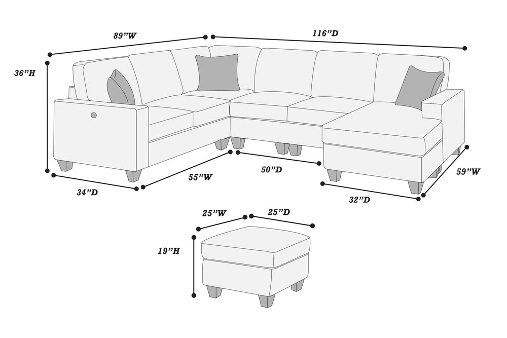 - Includes 5 Pieces: Left-Arm Loveseat w/ USB ports, Right-Arm Loveseat with Chaise, Corner Wedge, Armless Chair, Cocktail Ottoman.