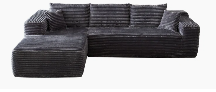 This black modular sectional sofa features plush corduroy upholstery and foam cushioning for comfortable, cloud-like seating. No assembly is required, making it ideal for living rooms, apartments, or bedrooms seeking stylish, relaxing seating with a reversible chaise lounge design.