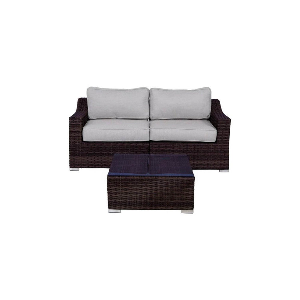 Transform your patio or garden into a welcoming retreat with this elegant all-weather wicker loveseat set designed for two. Featuring a spacious 66-inch-wide loveseat and a tempered glass coffee table, this modern sectional combines comfort and durability. Wrapped in handwoven brown HDPE wicker, resistant to fading and cracking, it stands up to all seasons with ease. Plush 5-inch (13 cm) foam cushions are upholstered in water-, UV-, and mildew-resistant polypropylene and olefin fabric, ensuring lasting softness and easy care. The rust-resistant aluminum frame adds strength without the weight, making this set both sturdy and easy to maintain. Fully assembled for instant enjoyment, it's perfect for morning coffee or evening conversations. Elevate your outdoor relaxation today.