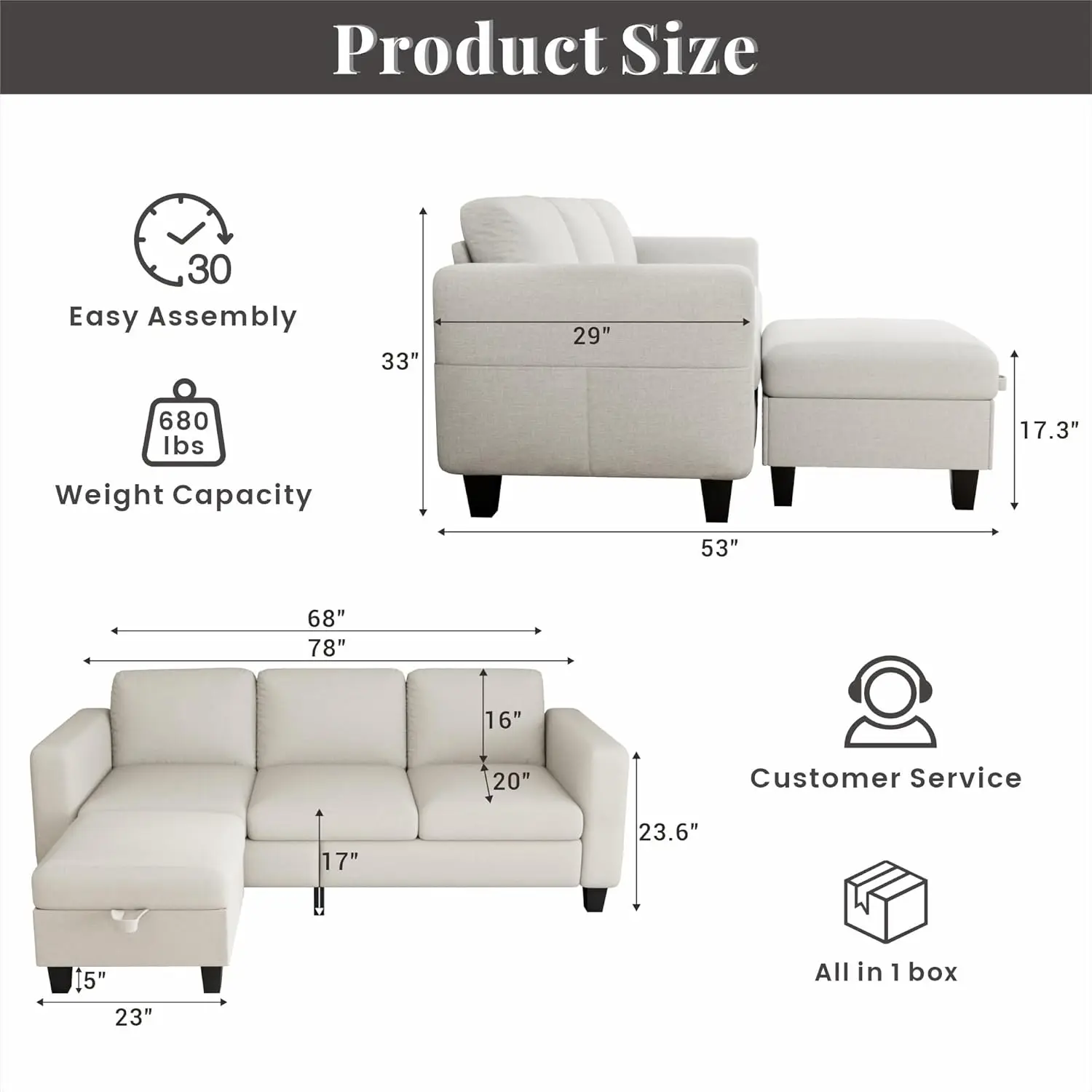 - Sectional couches for living room: Modern minimalist design, overall dimensions 29.5 inches deep (plus Storage Ottoman 53 inches), 78 inches wide, 33 inches high, minimalist style plus modular combinations, comes with a storage bench, a great choice for small spaces living spaces couch