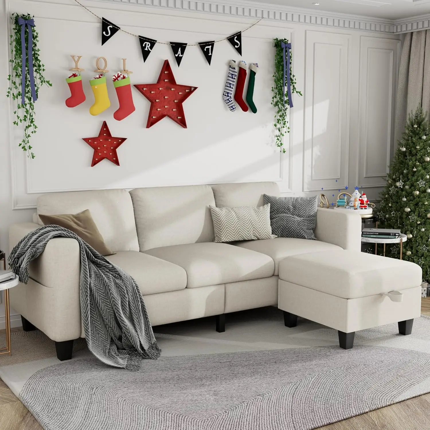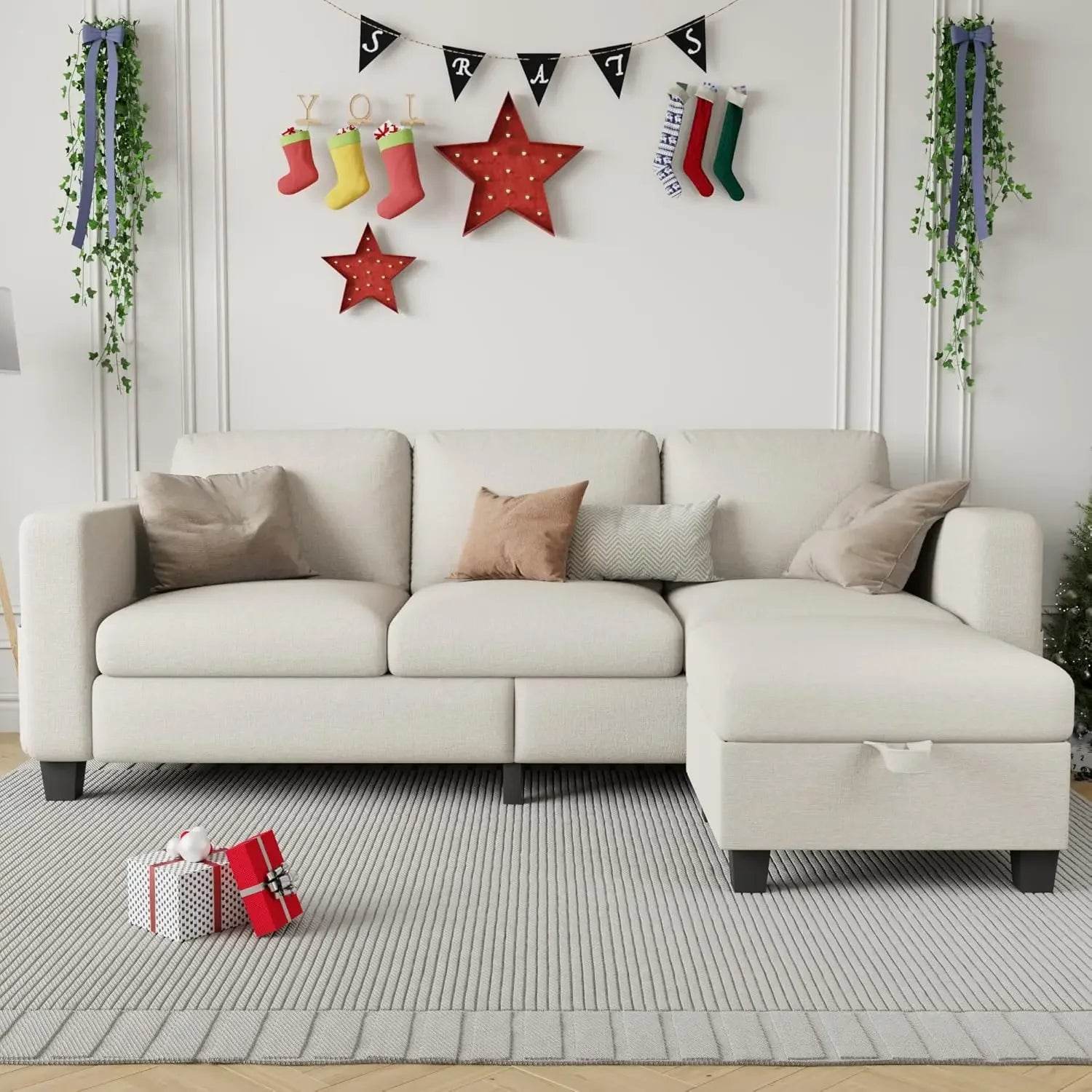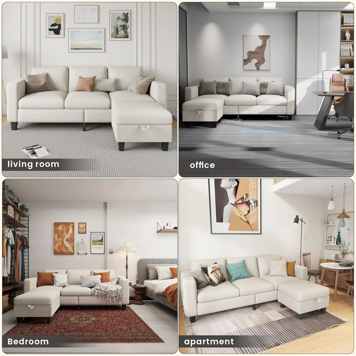 This L-shaped sectional sofa features breathable linen fabric, deep ergonomic seats, and a storage ottoman for small living spaces. Its modular design supports up to three seating, with removable washable covers and an oak wood frame for durable, comfortable relaxation.