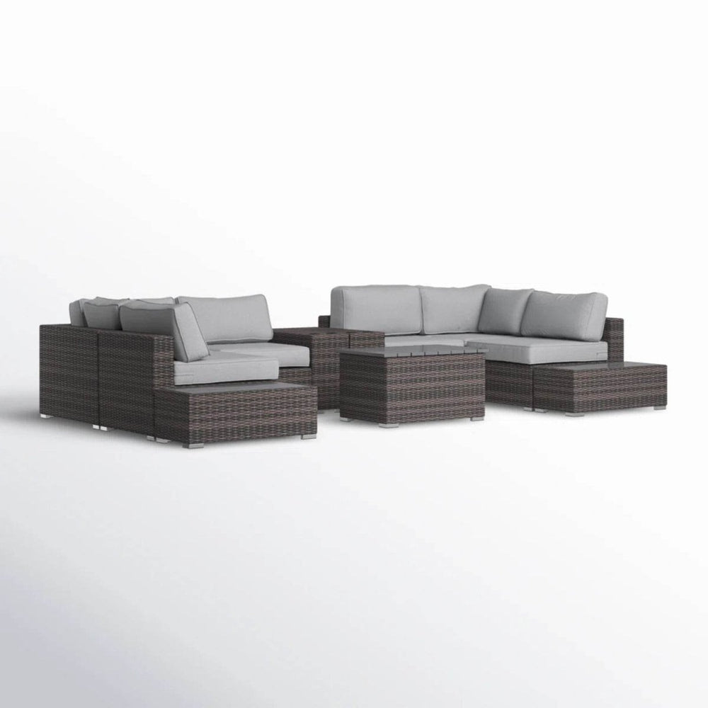 Upgrade your outdoor living with this stylish 4-person rattan wicker patio seating set, designed for comfort and durability. Featuring an oversized 148-inch wide sectional with ultra-soft 5-inch thick cushions, it provides generous deep seating perfect for relaxing with family and friends. The brown wicker base pairs elegantly with weather-resistant gray cushions that resist water, UV rays, and mildew—keeping your set looking fresh season after season. Crafted with a rust-resistant aluminum frame and stainless steel tabletops, this fully assembled set offers easy maintenance and long-lasting outdoor performance. Modular and reversible, it allows you to customize your lounge layout effortlessly. Whether entertaining or unwinding, this patio set brings both function and modern style to your outdoor space. Elevate your relaxation today.