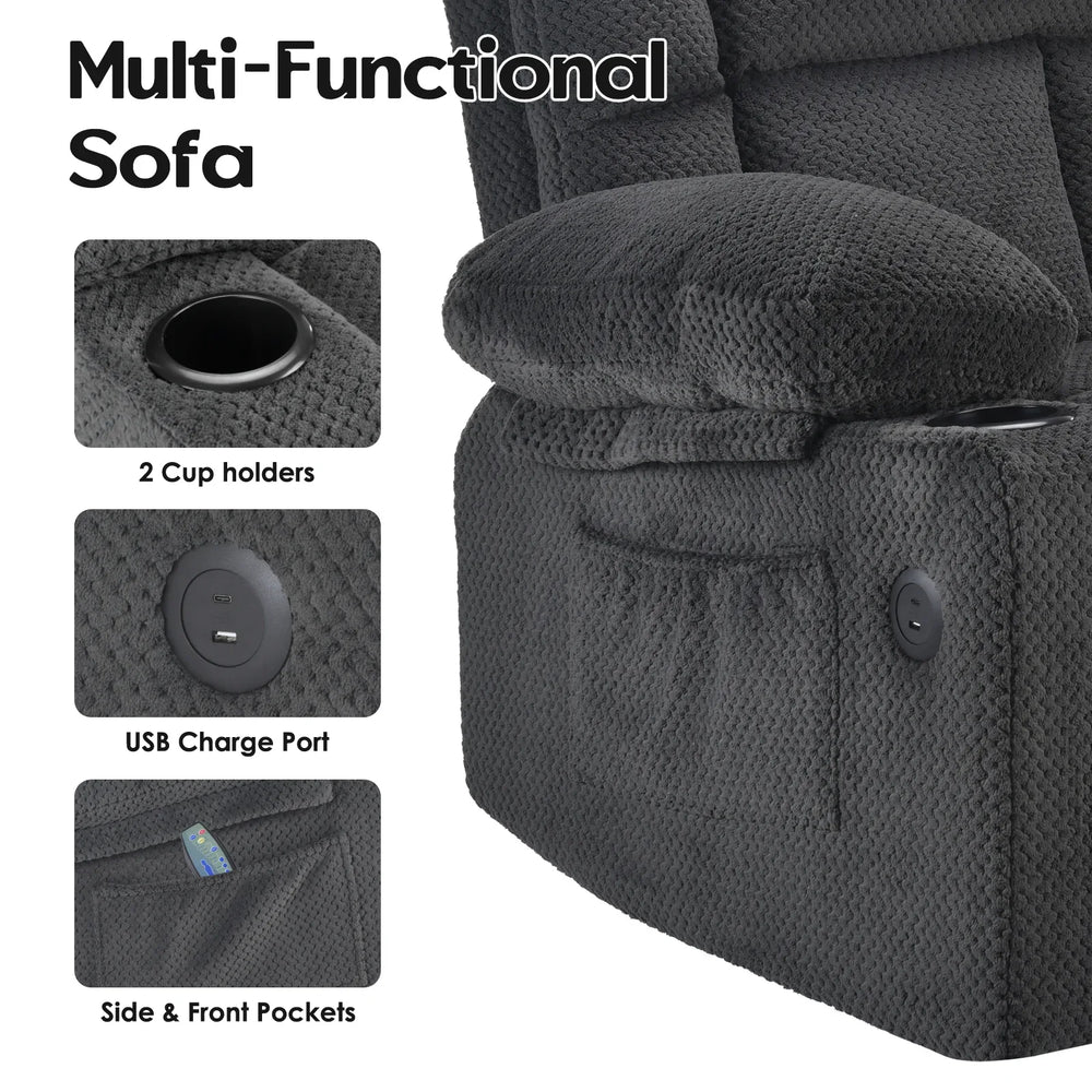 Designed specifically for elderly comfort and support, this power lift recliner chair combines advanced features that make daily living easier and more enjoyable. The sturdy metal frame ensures long-lasting durability, while its smooth power lift system gently assists you in standing up without strain. Enjoy customizable reclining up to 135° to find your perfect position for reading, watching TV, or relaxing. The integrated 8-point massage and heat system soothes tired muscles with multiple modes and a convenient timer. Thoughtfully equipped with USB ports and cup holders, this recliner keeps your devices charged and beverages within easy reach. Its compact 29" L x 31.5" W x 42.8" H size fits comfortably in living rooms or bedrooms, supporting up to 350 lbs. Easy to assemble without tools, it’s ideal for enhancing independence and well-being. Elevate your relaxation and reclaim comfort today.